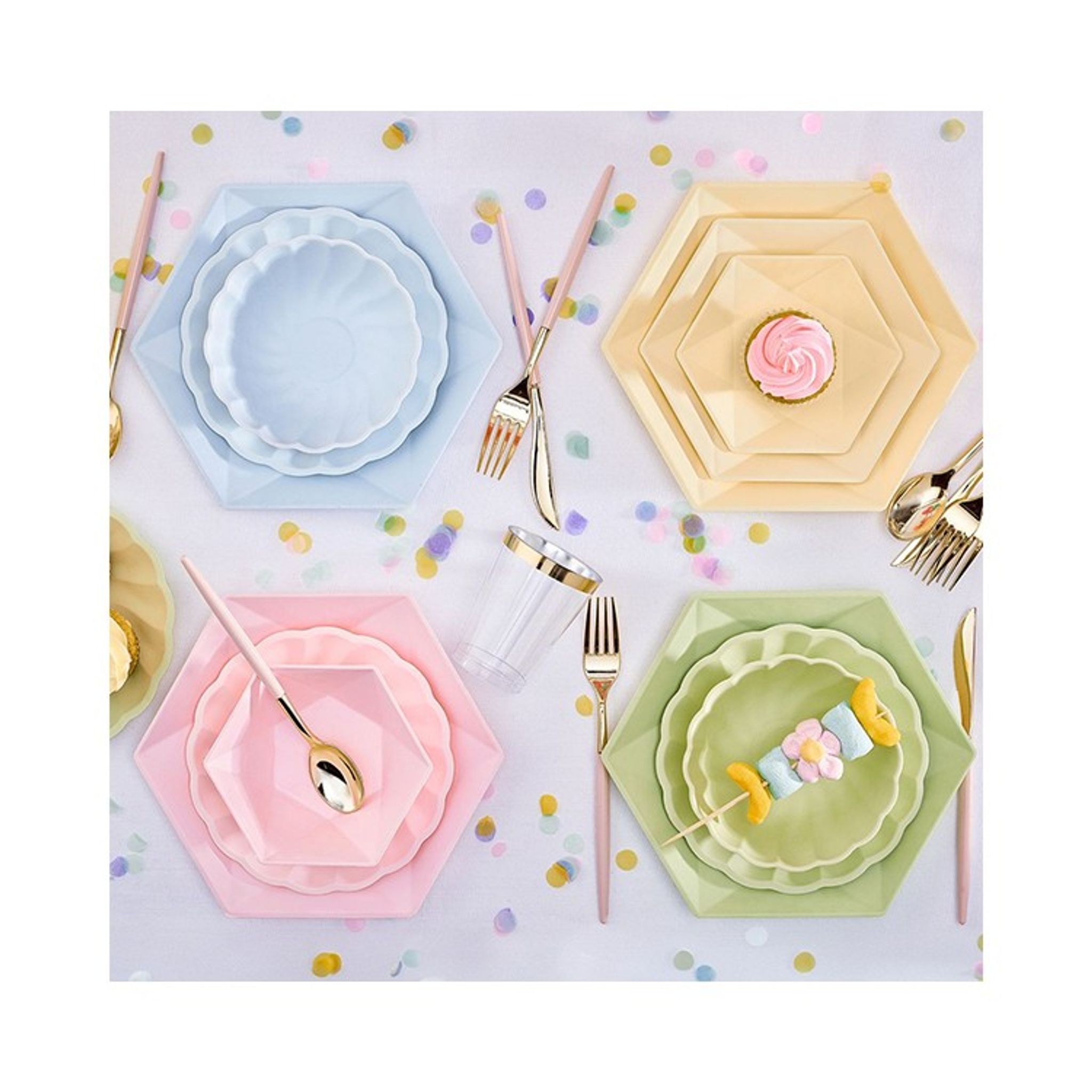 Med våra fina assietter i grönt med formen av en hexagon kan du bjuda på en liten förrätt eller kakfest. Assietten ger en lyxig känsla och är tillverkade i förnybart material och innehåller inte någon plast.