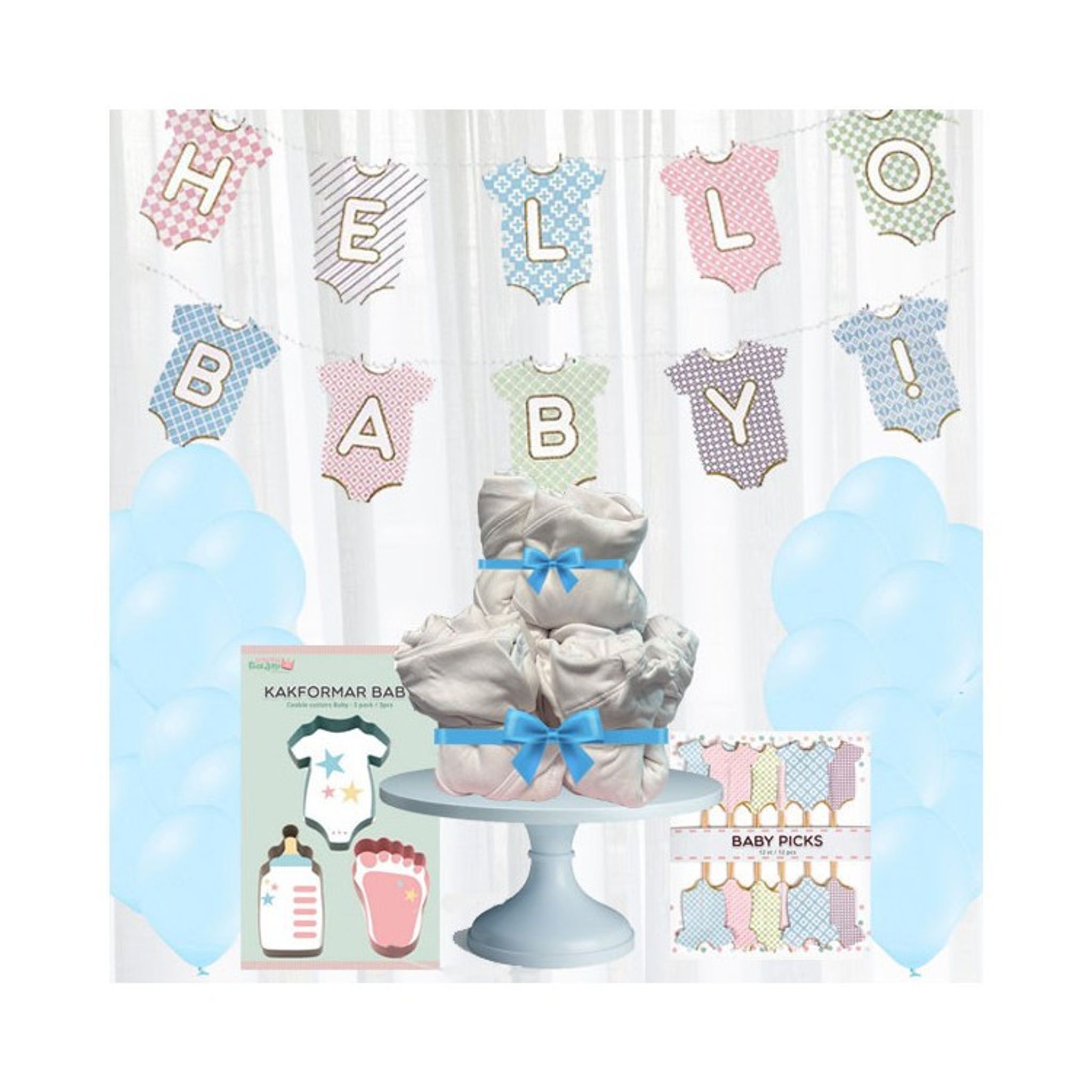 Färdigt kit med dekorationer och present till Babyshowern!