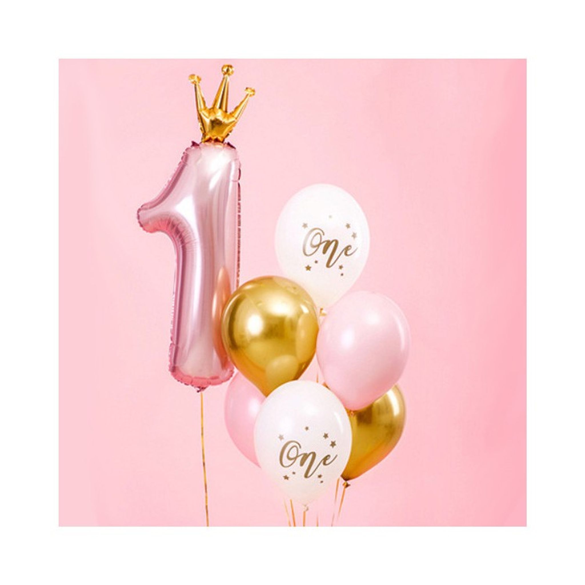 Komplett ballongkit med 1 st folieballong i en skimrande läcker rosa färg i form av siffran 1 med en guldkrona samt 6 st latexballonger i en mix av färger som matchar fint i vitt, rosa och guld med texten one på några av ballongerna.