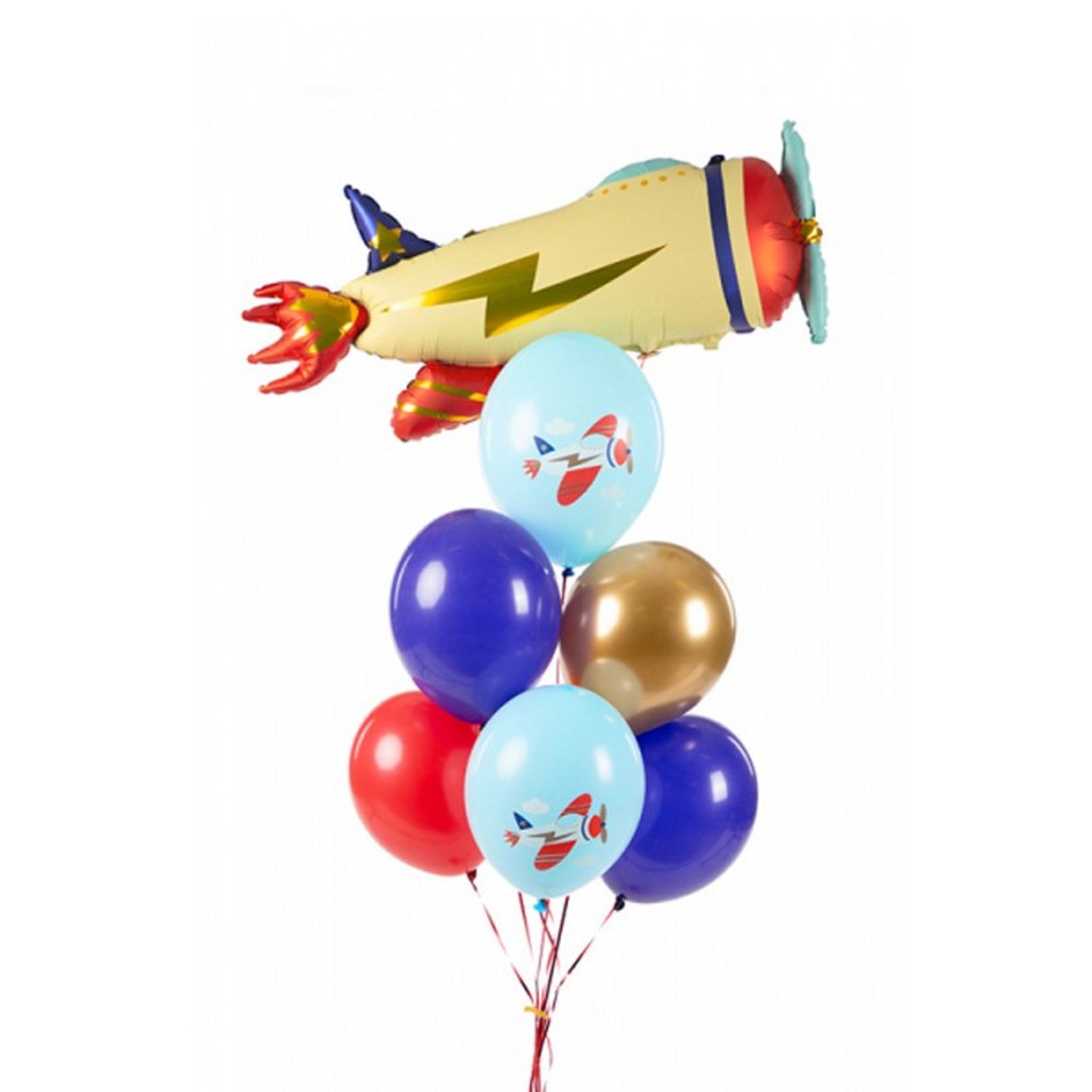 Komplett ballongkit med 1 st folieballong i form av ett flygplan samt 6 st latexballonger i en färgstark mix av blått, rött och guld med motiv av flygplan på några av dom.