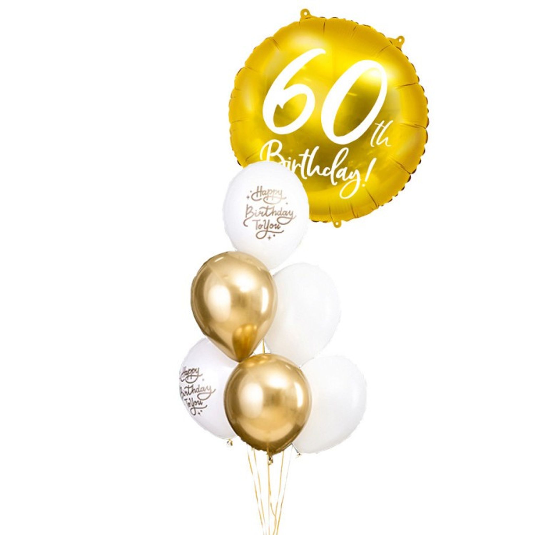 Komplett ballongkit med 1 st folieballong 60 år i guldfärg samt 6 st latexballonger i en mix av färger som matchar fint och som har texten Happy Birthday To You tryckt på några av ballongerna.