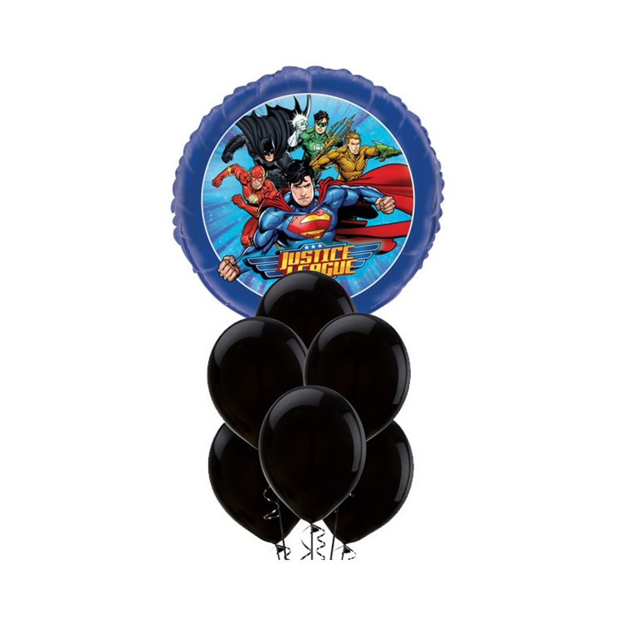 Komplett ballongkit med 1 st folieballong med motiv av Justice League figurer samt 10 st latexballonger i svart.