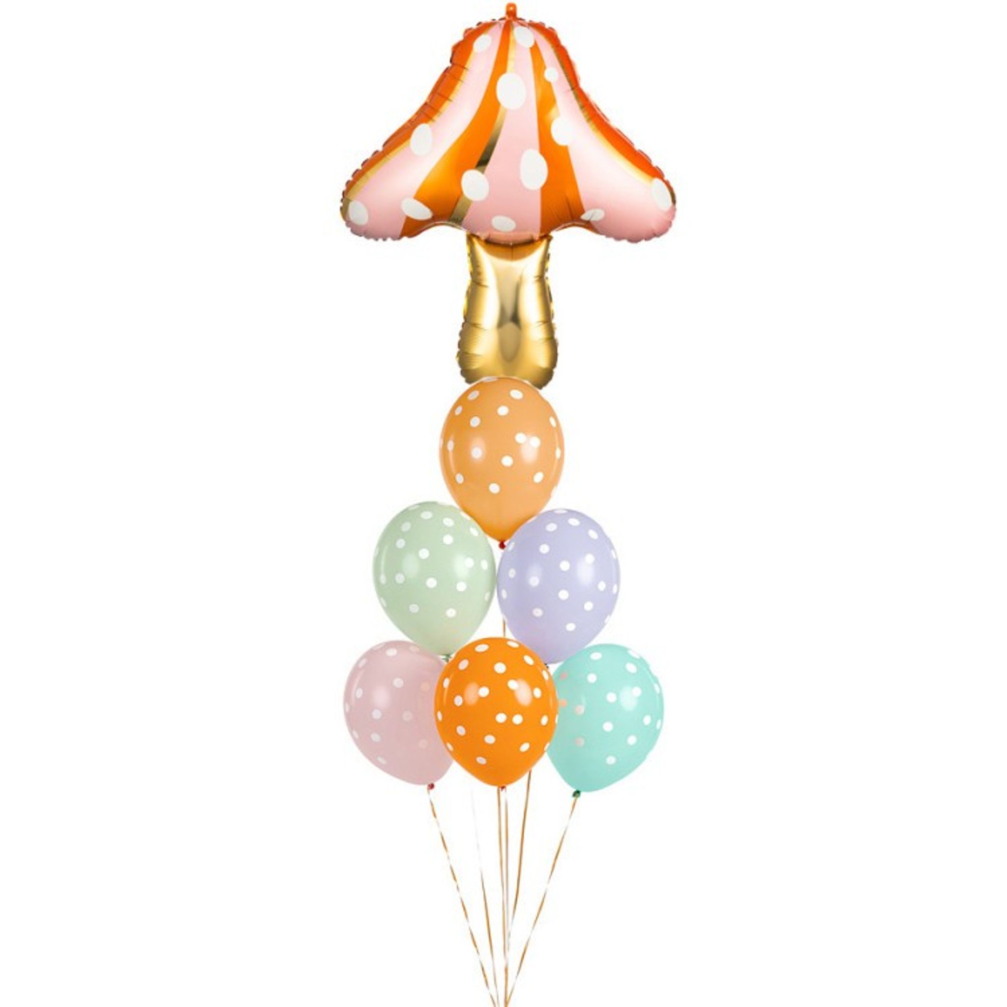 Komplett ballongkit med 1 st folieballong svamp i en härlig pastellfärg samt 6 st latexballonger som matchar fint i en mix av färger och med vita prickar.