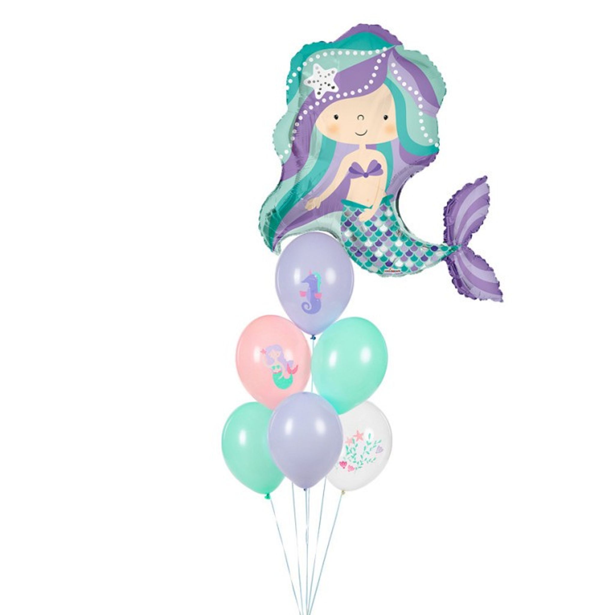 Komplett ballongkit med 1 st folieballong i form av en sjöjungfru samt en mix av 6 st latexballonger, varav några har motiv av tema mermaid.