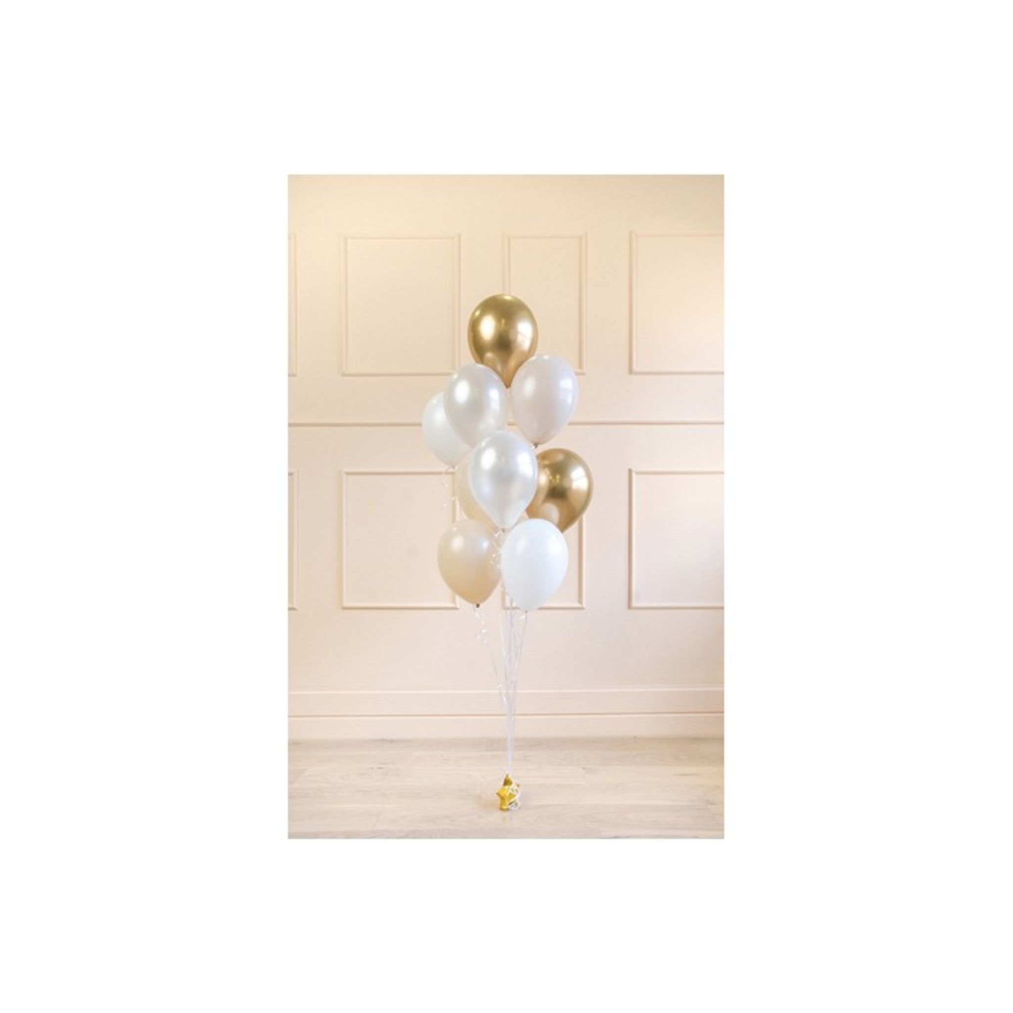 1 paket innehåller 10 st ballonger i latex. (3 st beigevit, 3 st metallic vit, 2 st pastellvit, 2 st metallic guld)