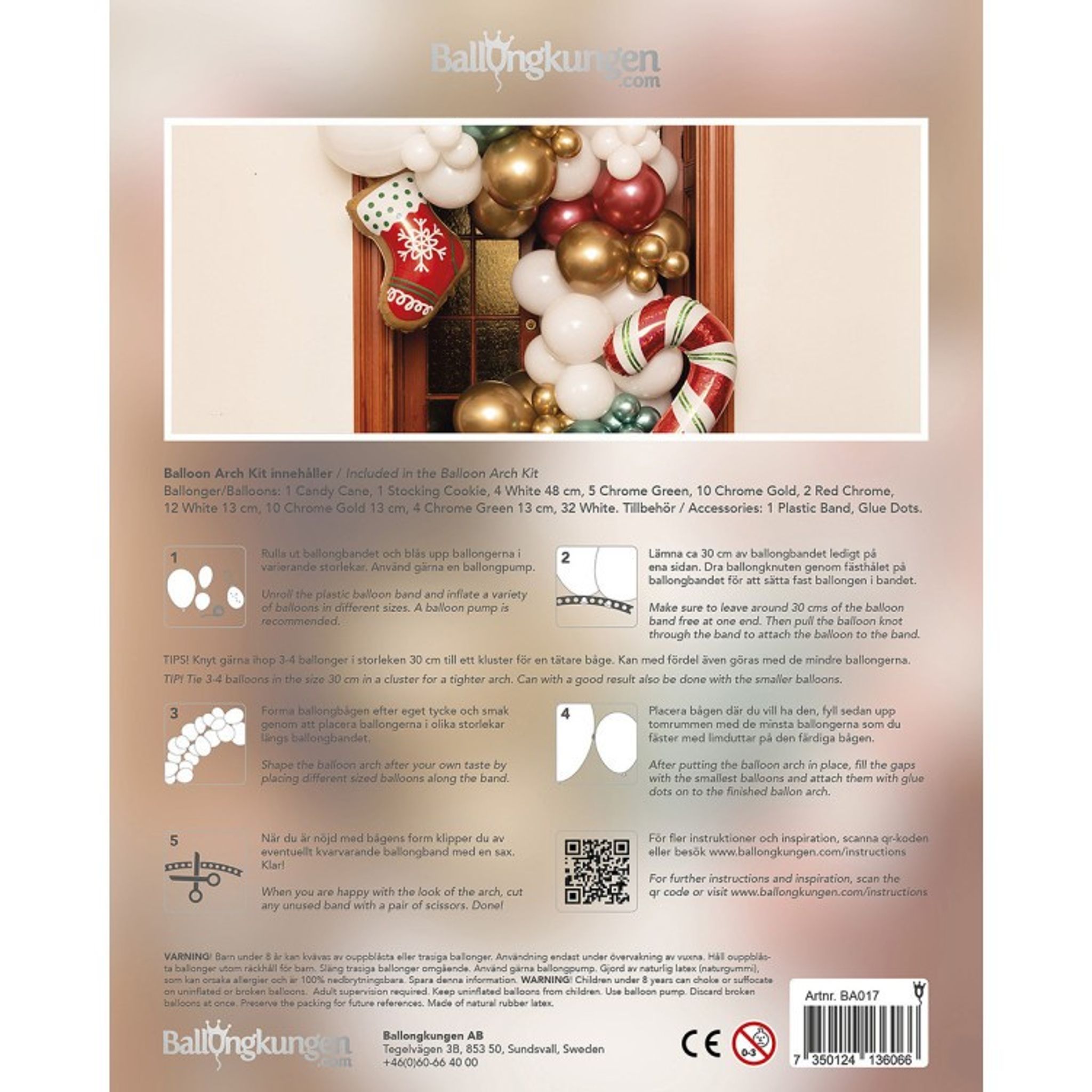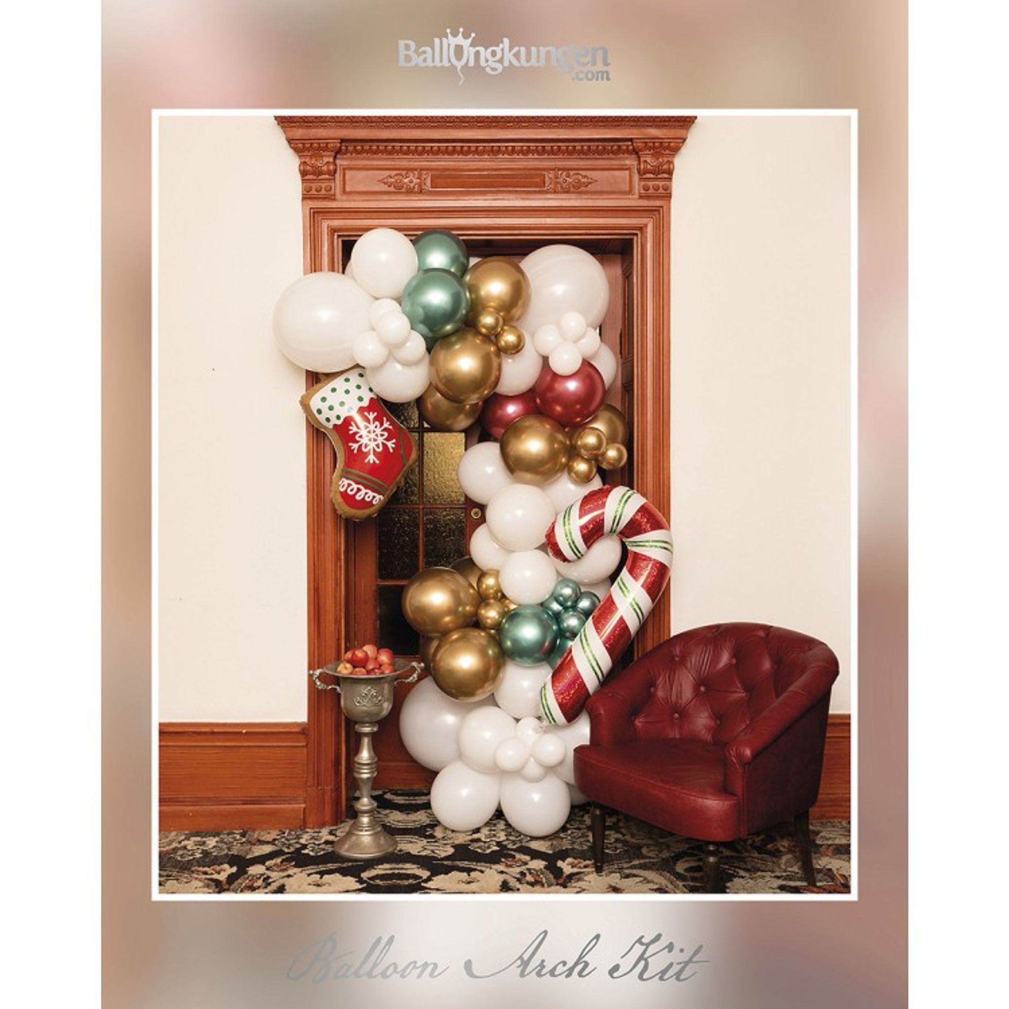 Den perfekta ballongdekorationen att välkomna gästerna med till jul. En ballongdekoration som går i rött, vitt, grönt och guld = julens alla färger! Ballongdekorationen består både av vanliga ballonger samt folieballonger i form av polkagriskäpp och julstrumpa.