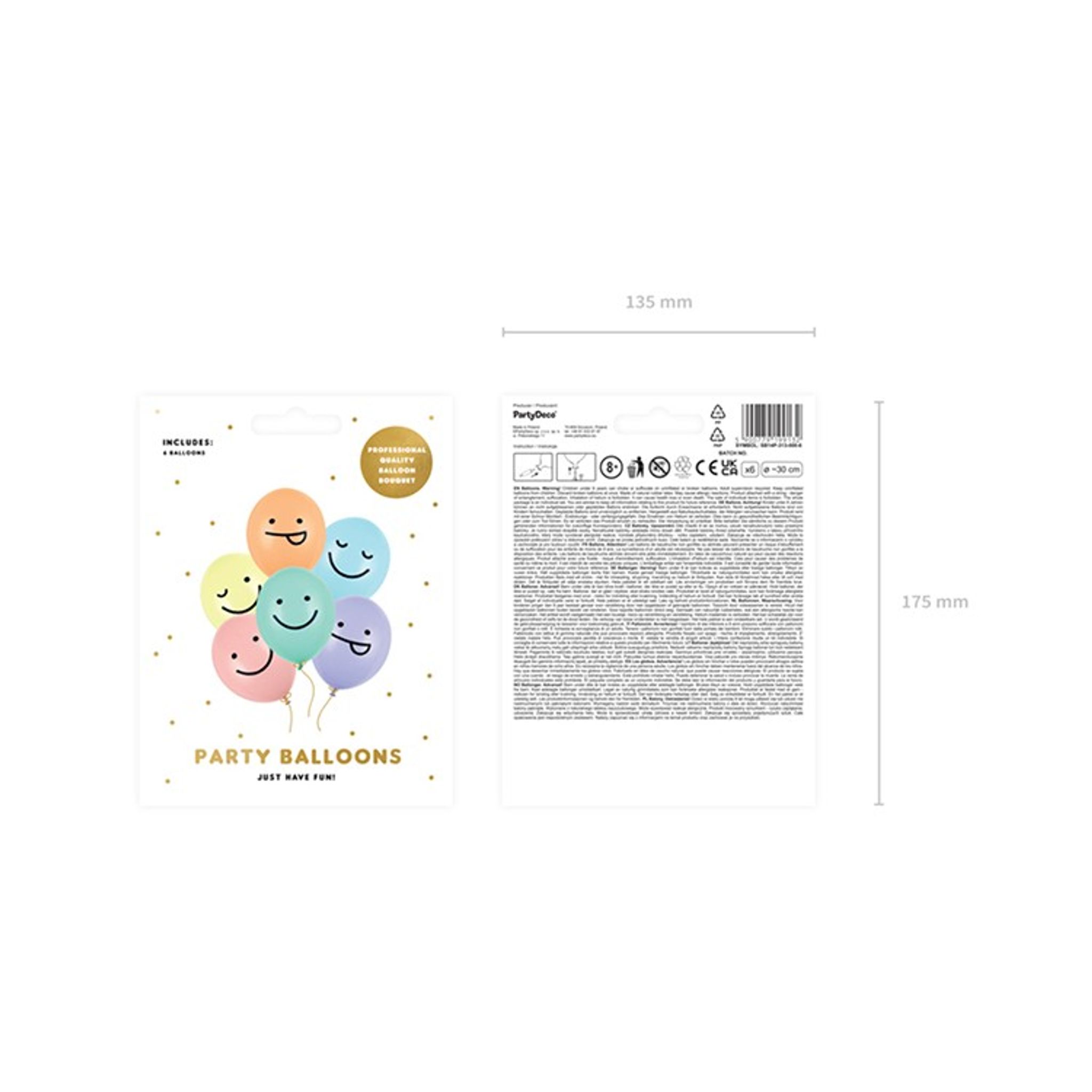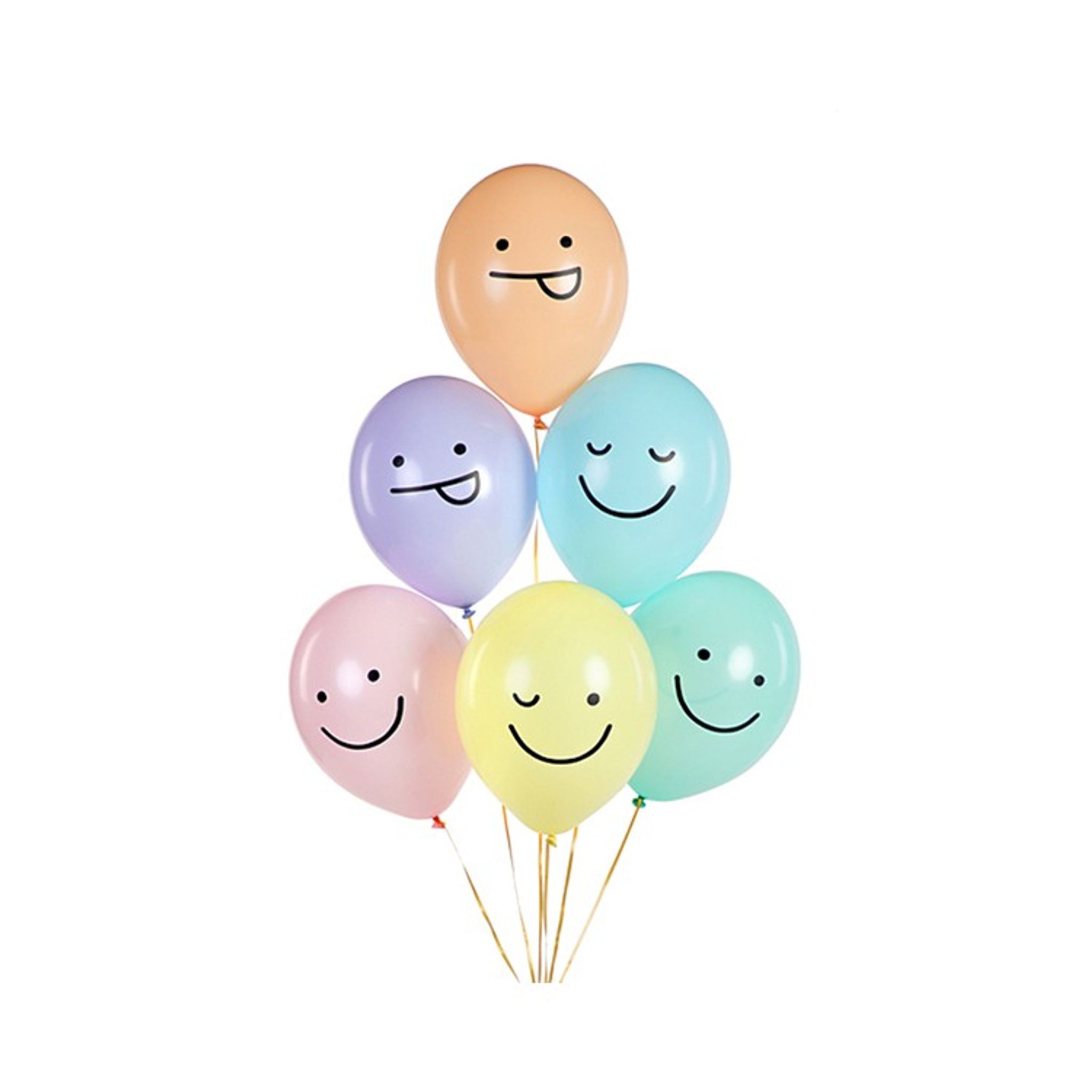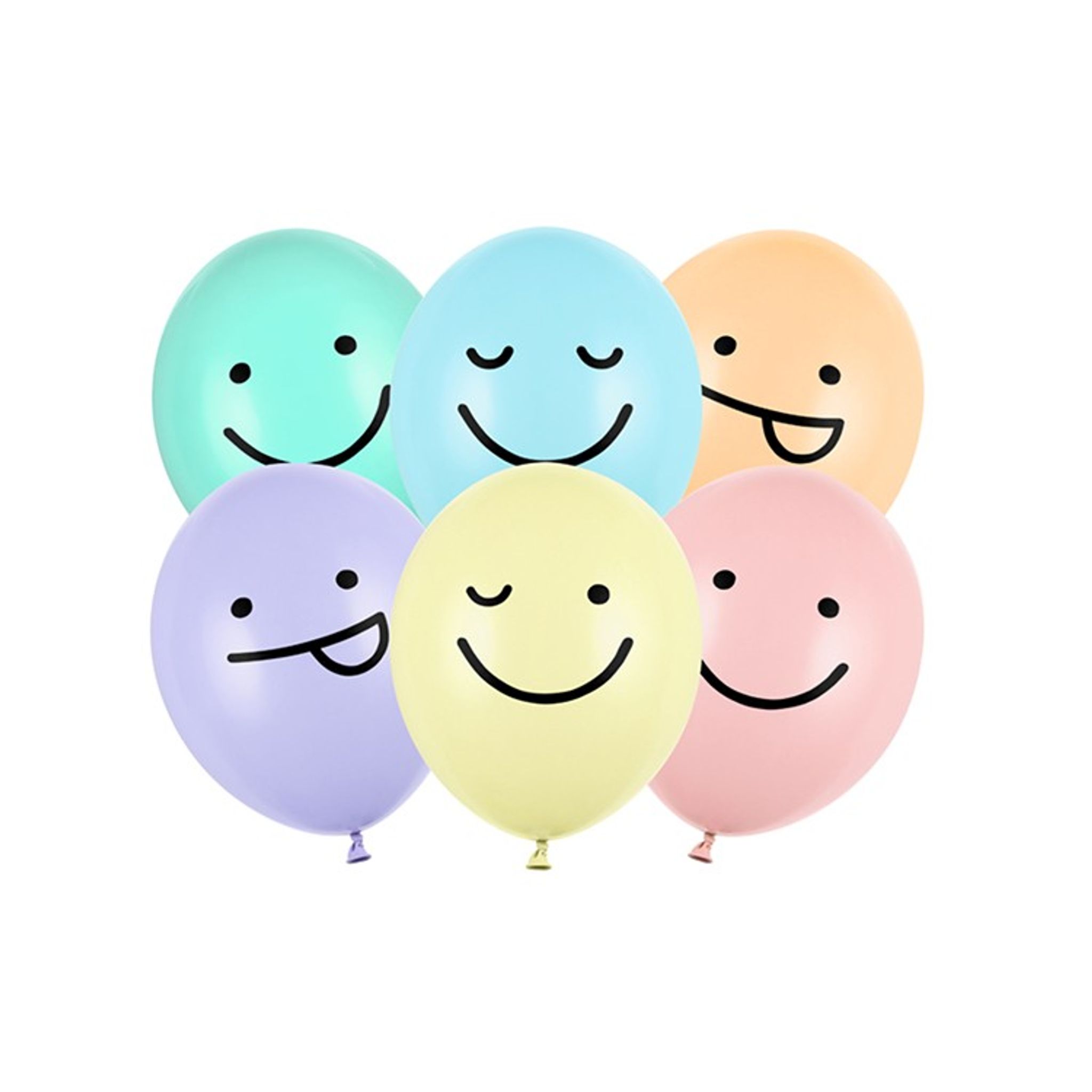 Pastellfärgade ballonger med svart tryck i form av ansikten. Priset avser 6 stycken ballonger i färgerna: mintgrön, ljuslila, ljusrosa, ljusorange, ljusgul och ljusblå. Storlek ca 30 cm.