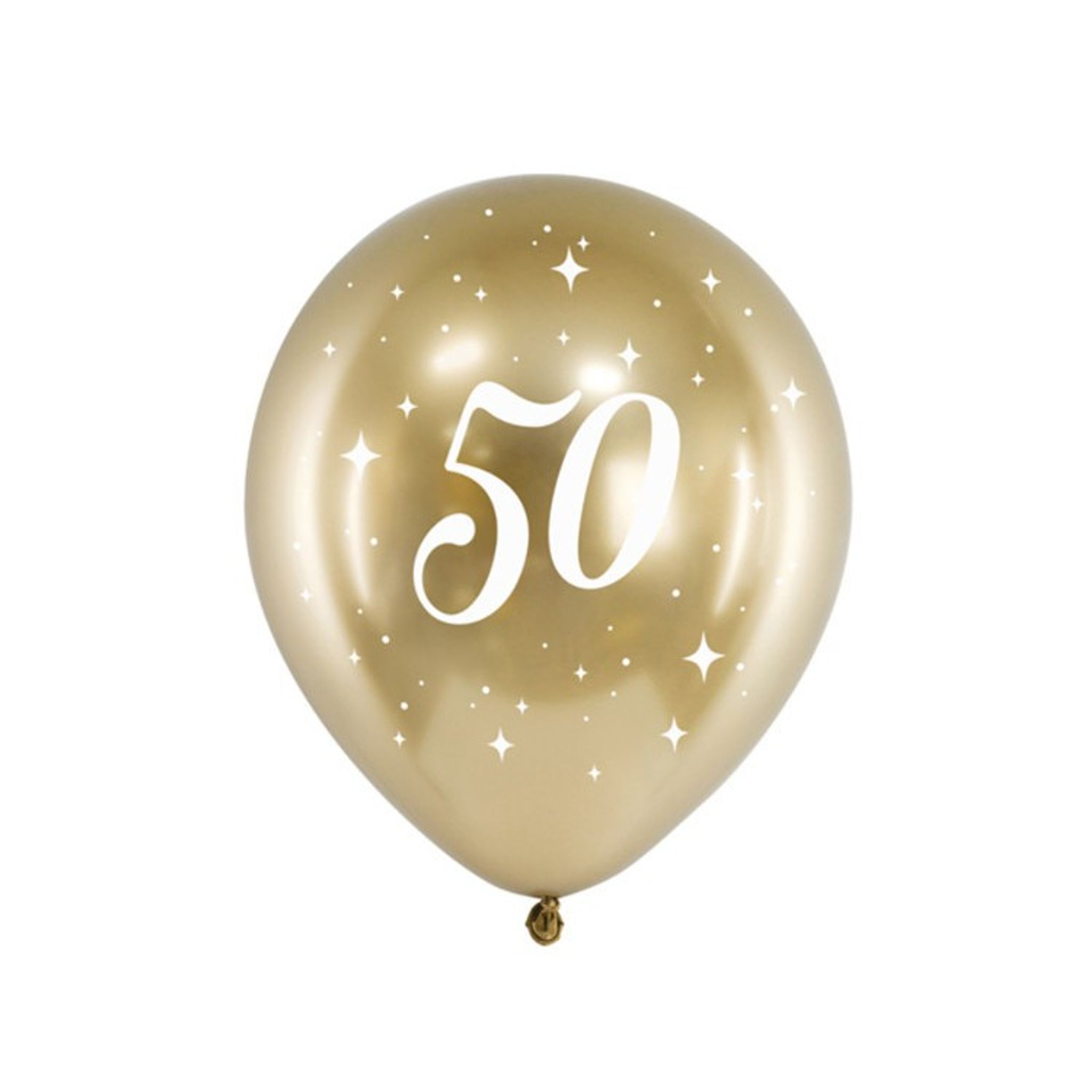 Ballonger med siffran 50 guld. Ett perfekt sätt att dekorera 50-års festen! Förpackningen innehåller 6 st ballonger. Storlek: ca 30 cm när de är uppblåsta.