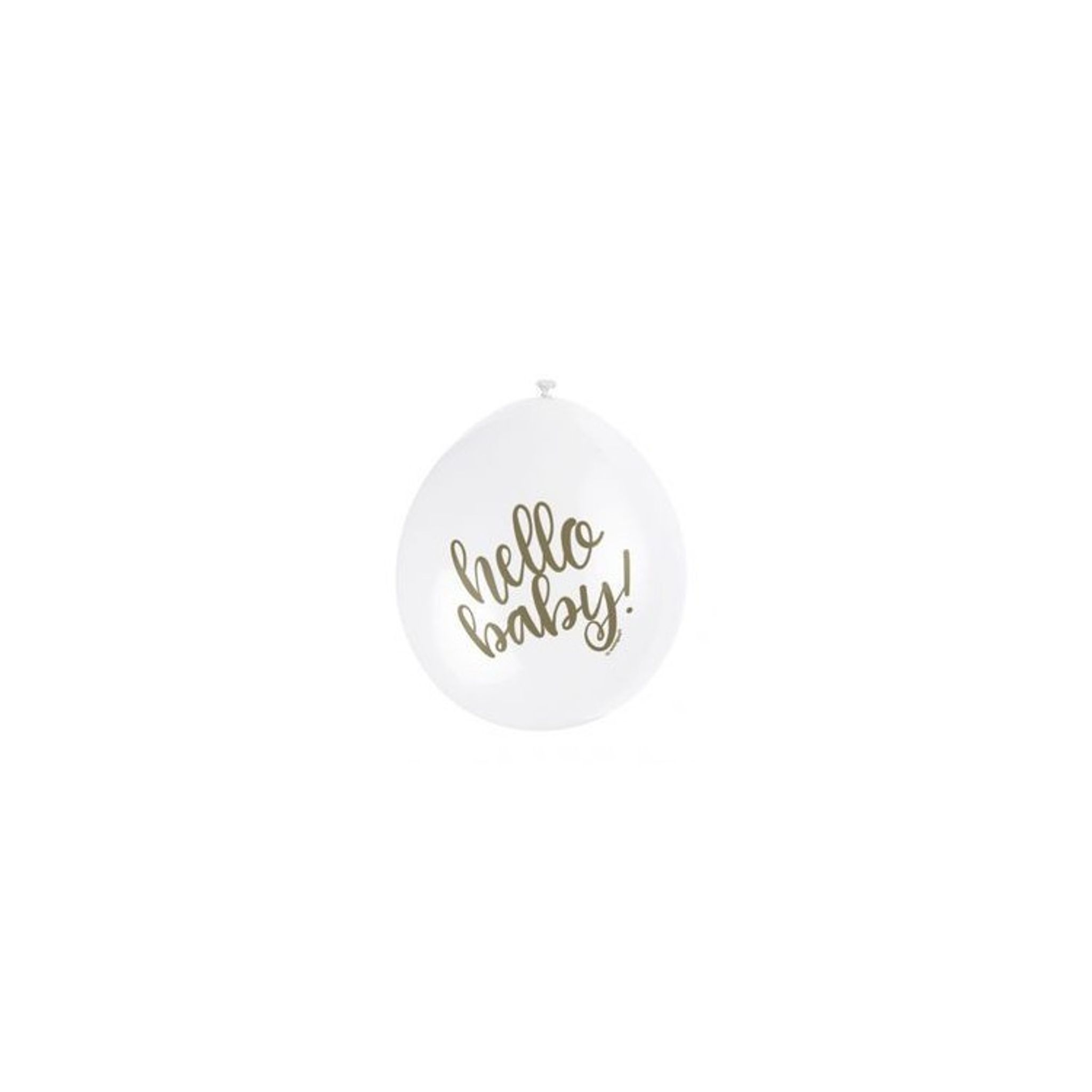 Med hjälp av dessa ballonger gör ju enkelt detta på ett snygg sätt. Ballongerna är vita och har texten "hello baby!" i guld. Perfekt att blåsa upp och använda som dekoration.