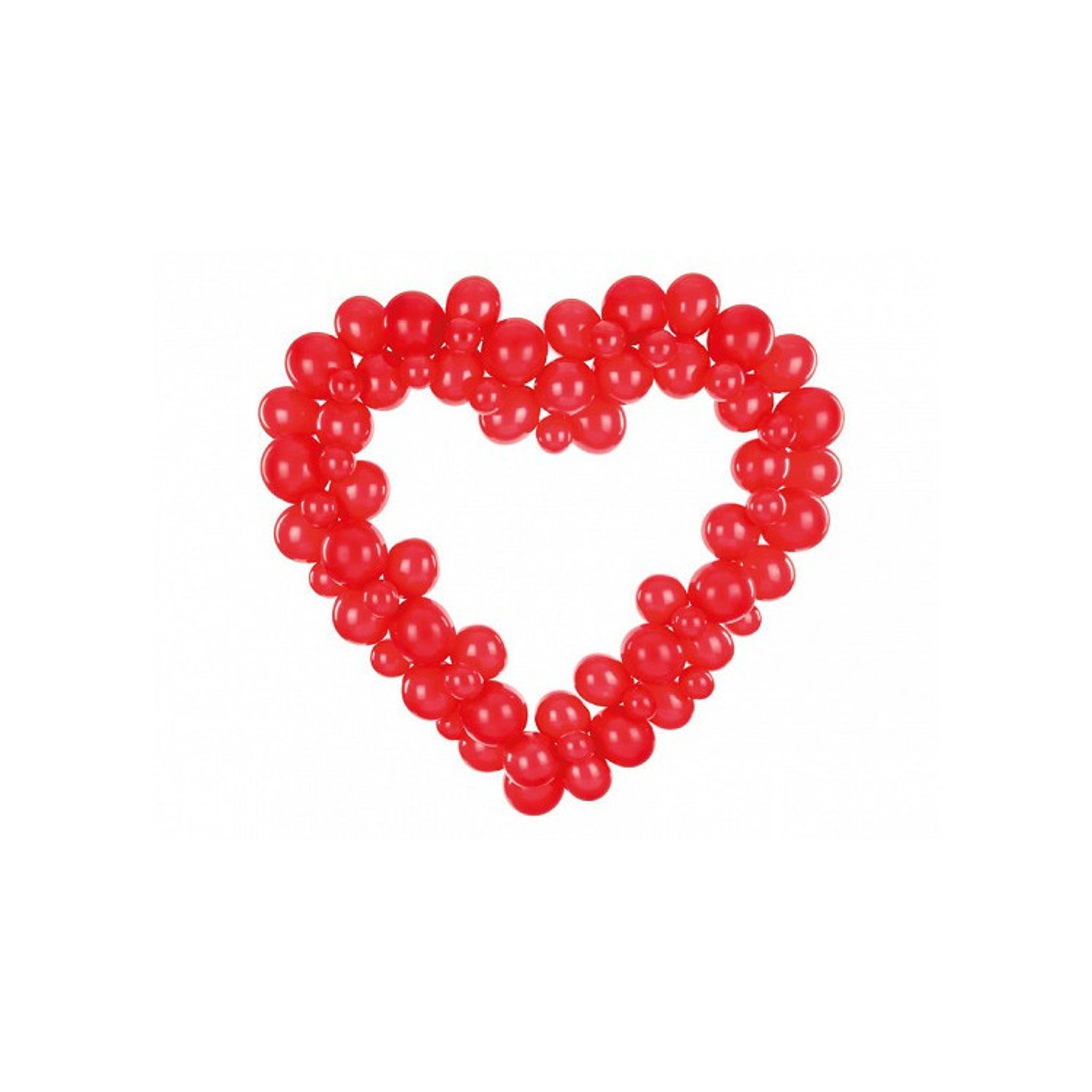Röd ballonggirlang med ram, setet innehåller 68 ballonger i röd färg (tre olika storlekar), 16 kartongelement, 20 st dubbelsidiga klistermärken samt instruktioner.