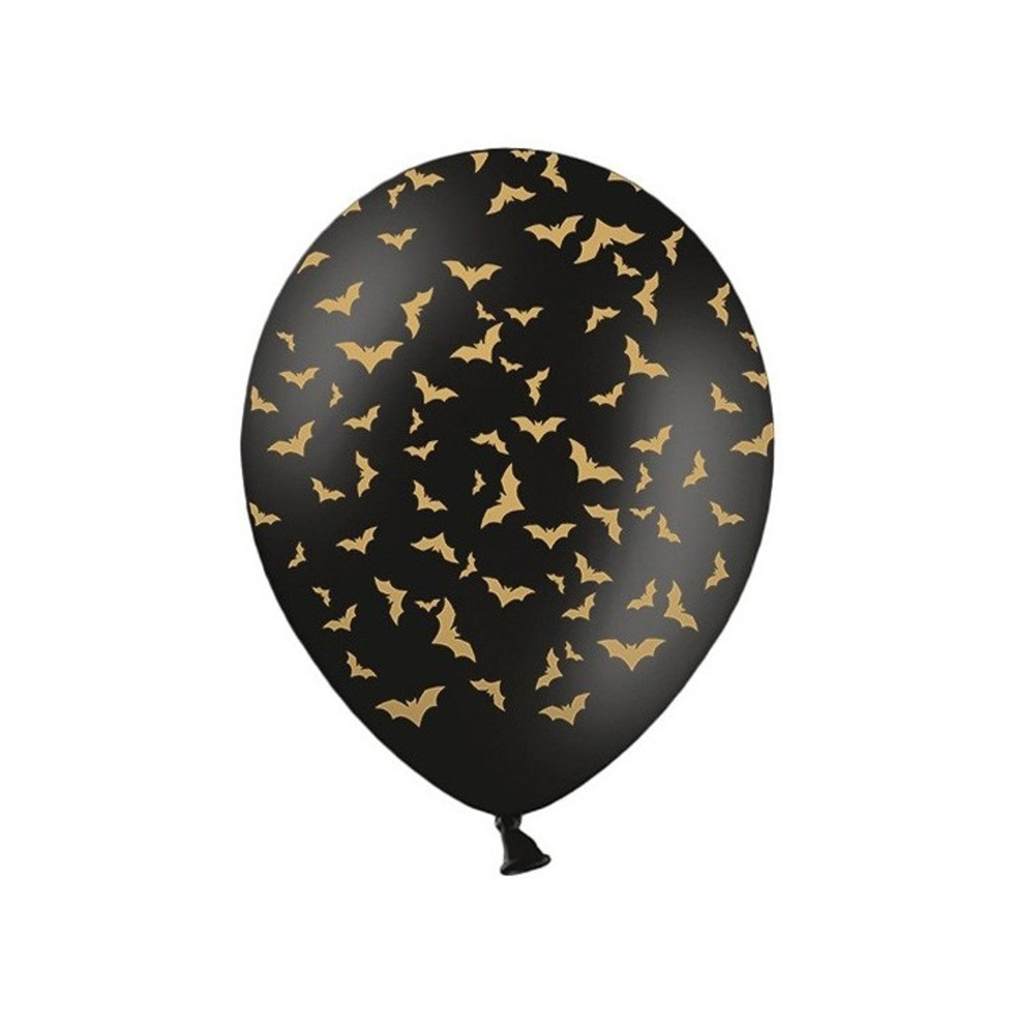 Mycket snygga latexballonger i svart med motiv av små fladdermöss i guld. Ballongerna blir perfekta att dekorera med på Halloweenfesten. Kombinera gärna med andra snygga ballonger, tex svarta och guld enfärgade.