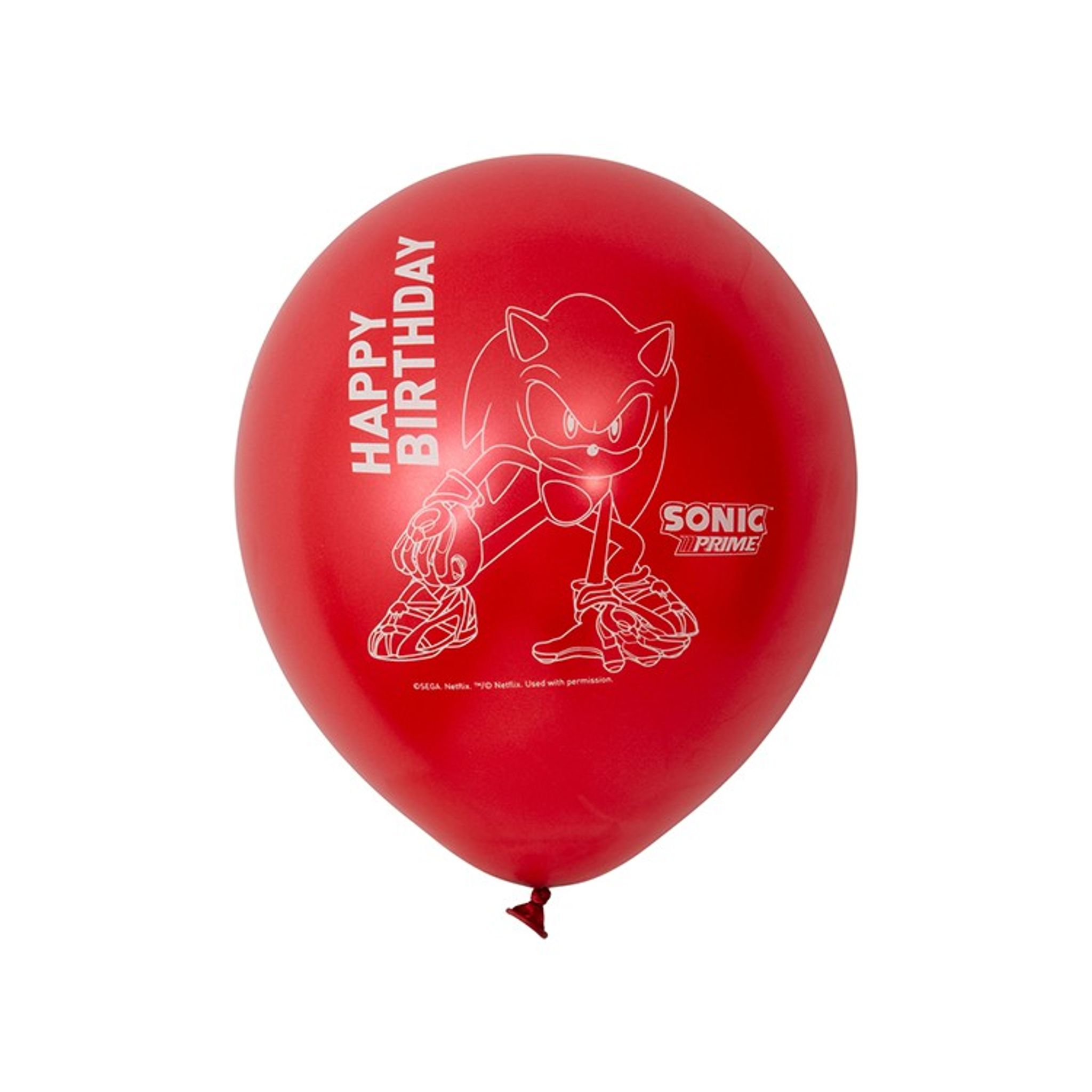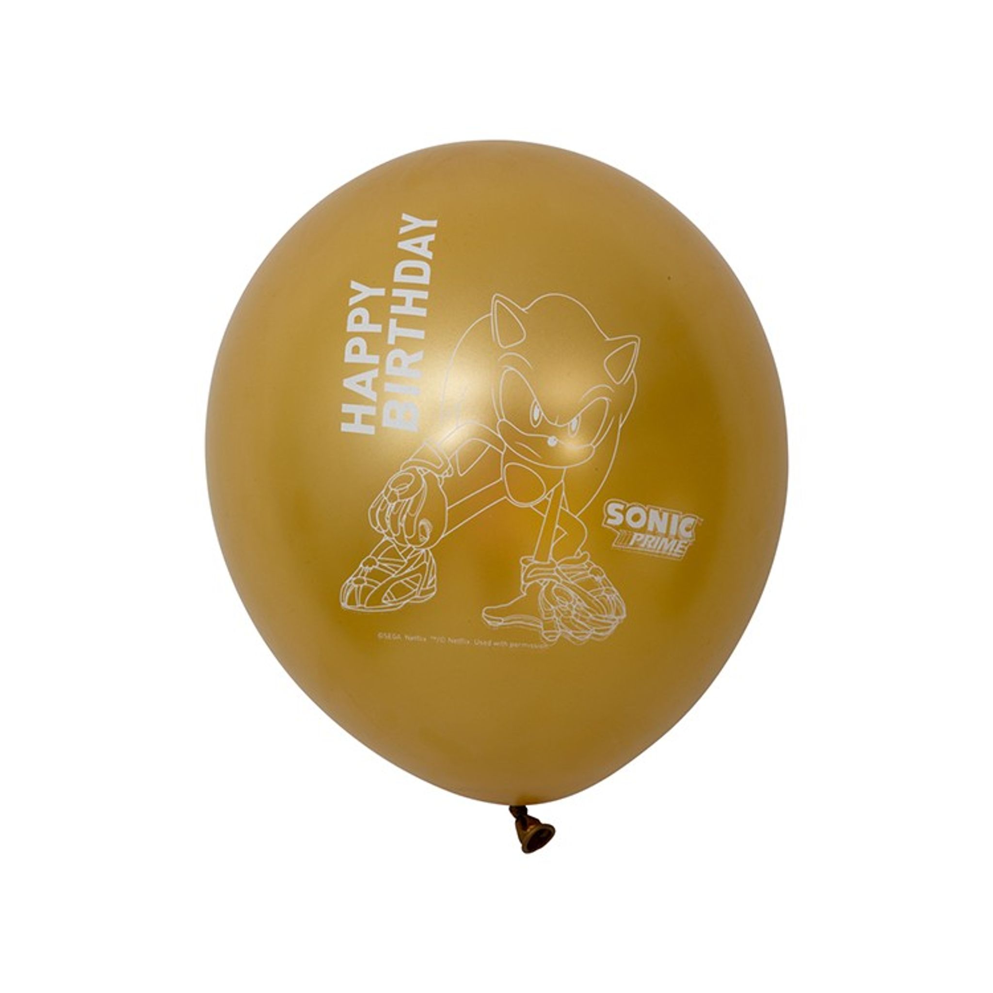 Priset avser 6 stycken metallic ballonger, 2 röda, 2 lila och 2 guld med vitt print med motiv av Sonic och texten Happy Birthday.