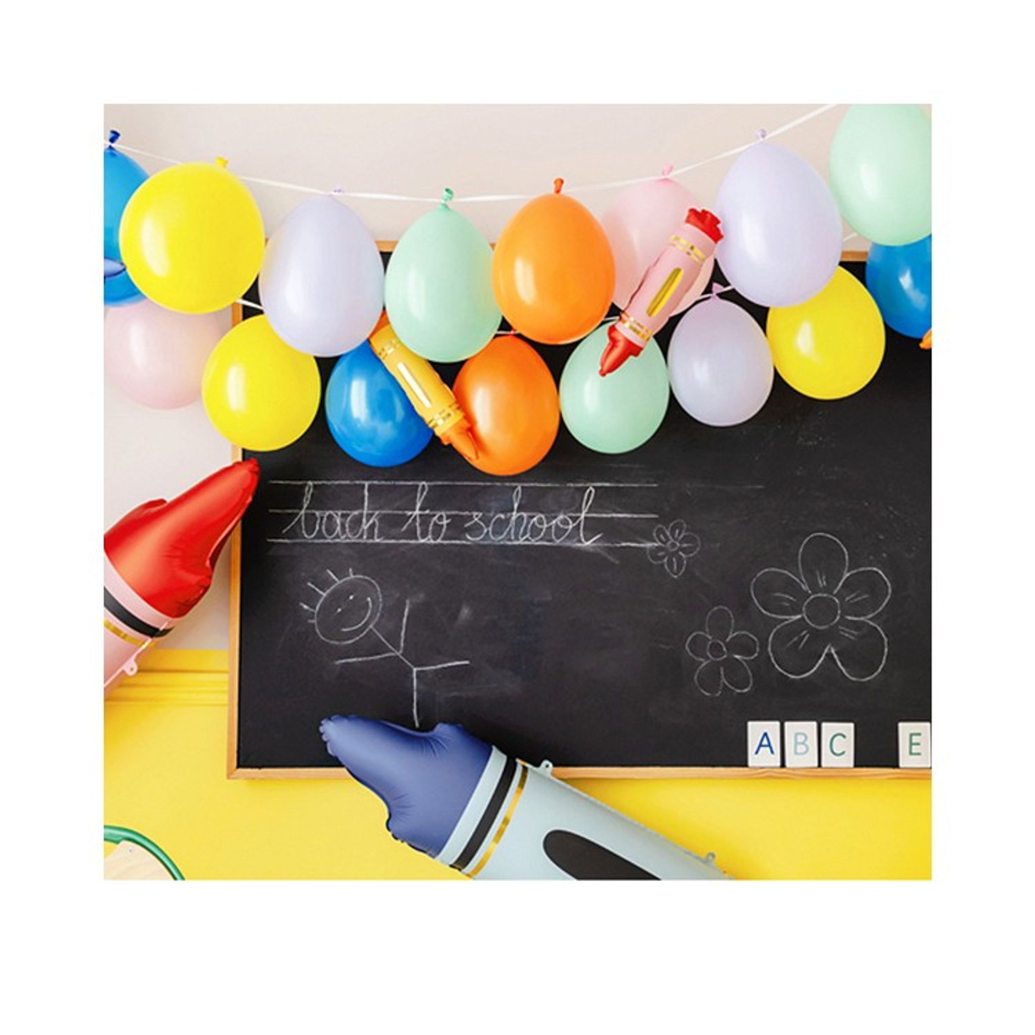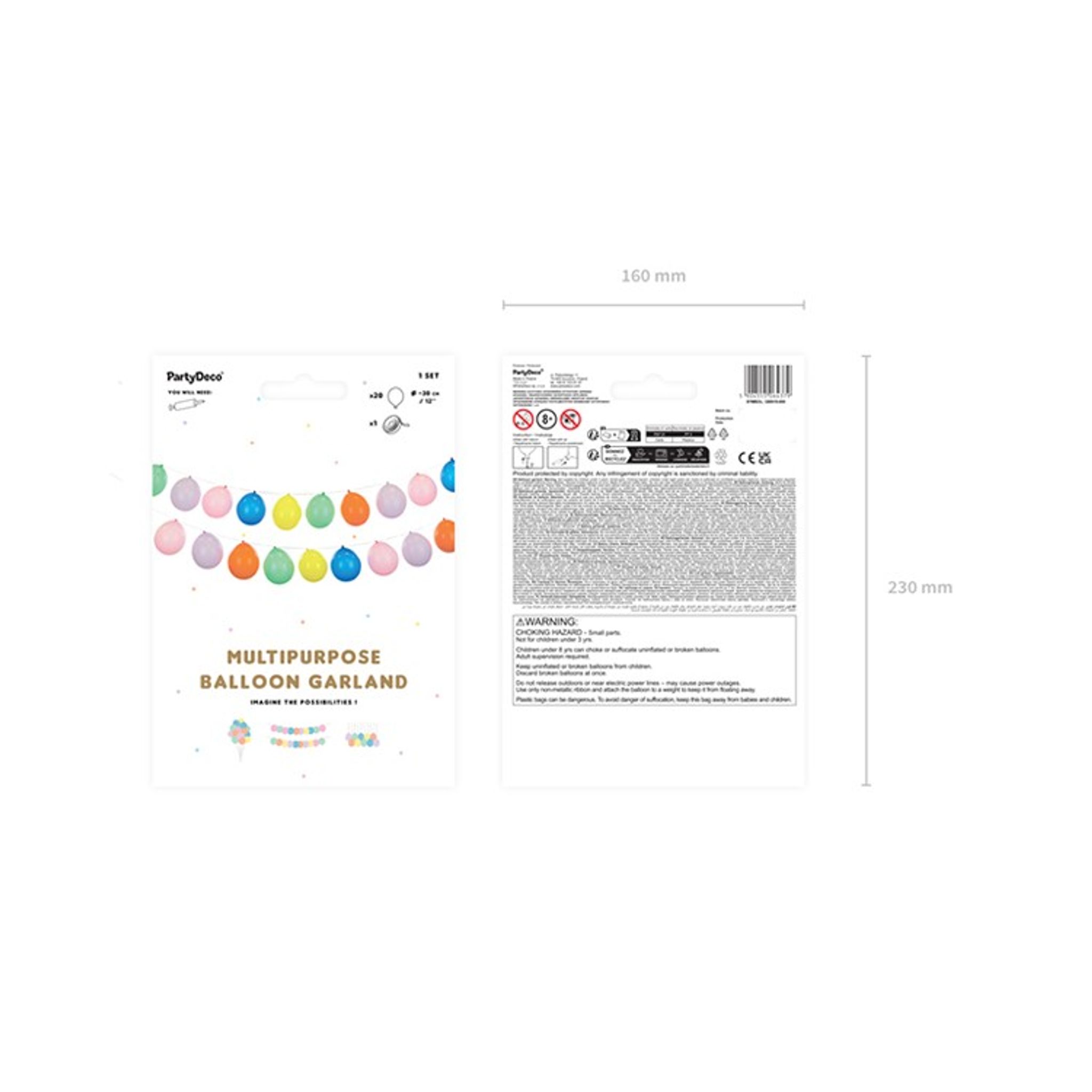 Ballonggirlang i en mix av olika färger. Förpackningen innehåller 20 stycken latexballonger och 25 m snöre. Här har du tre olika monteringsalternativ. Du kan skapa en ballonggirlang med ballongerna på ett långt snöre eller knyta varje ballong på ett kort snöre och sedan hänga på en lång rad eller skapa en härlig ballongbukett av alla 20 ballonger.