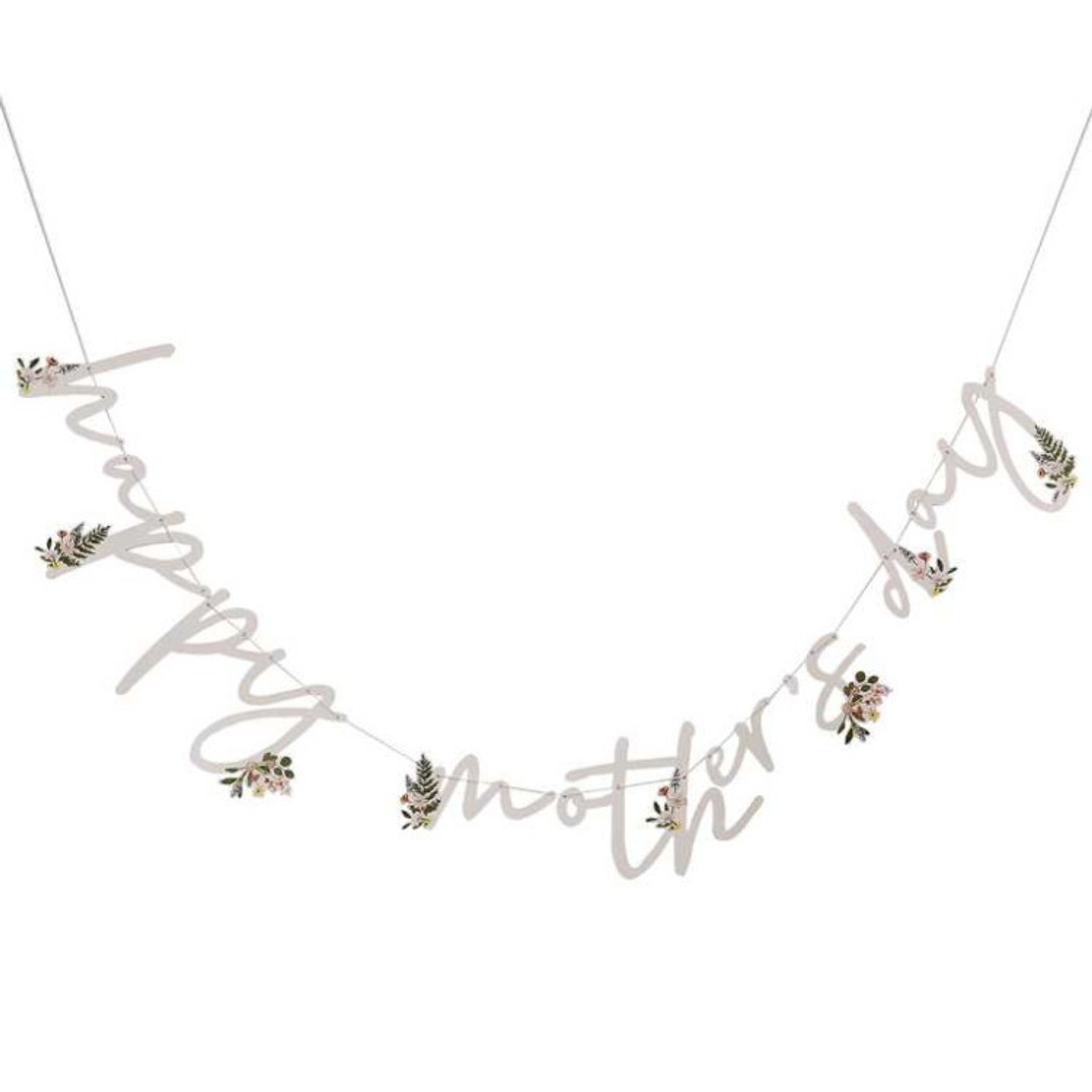 Skall du fira din mamma på Mors Dag och vill pynta och överraska lite extra så passar den här girlangen perfekt. Häng upp mot en vägg eller över det uppdukadet fikabordet för att glädja mamma på Mors Dag. Girlangen har texten "happy mothers day" med supersöta blommor på bokstäverna och den hänger i ett rosa snöre.