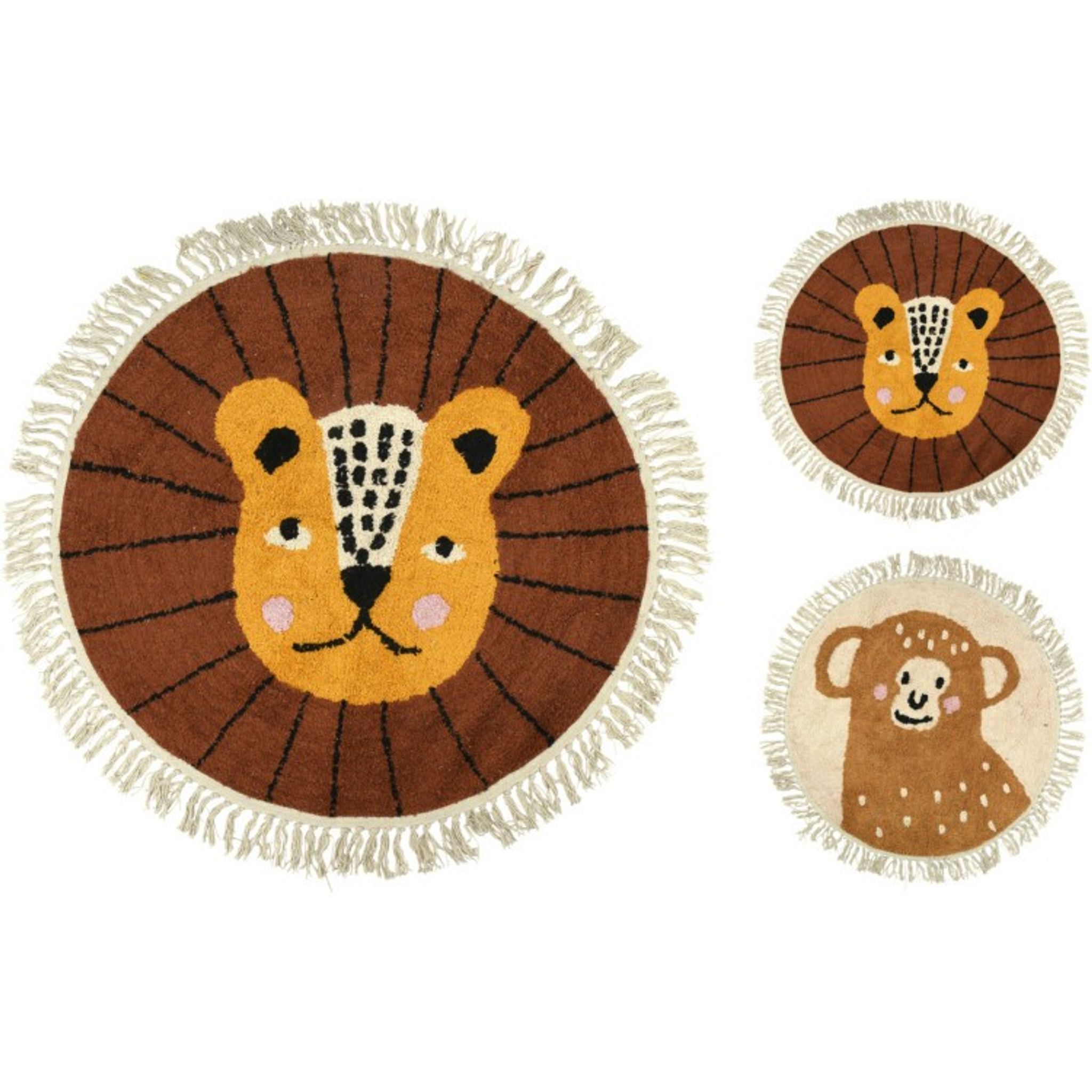 Fin rund barnrumsmatta med fransar och djur-motiv.
