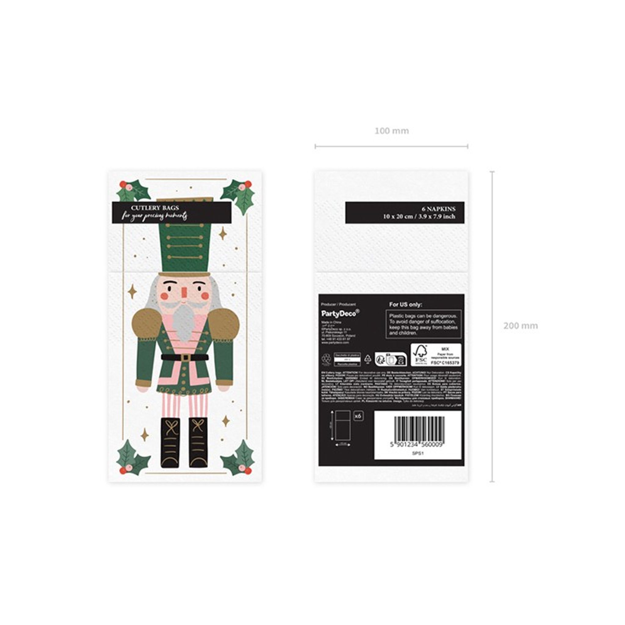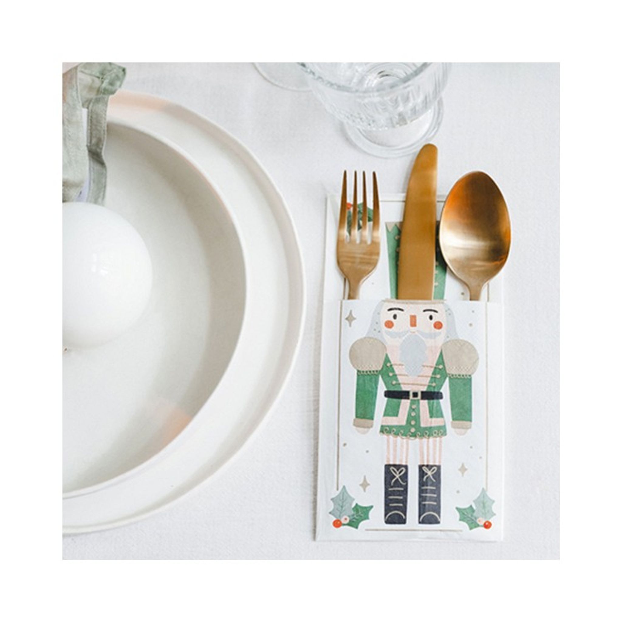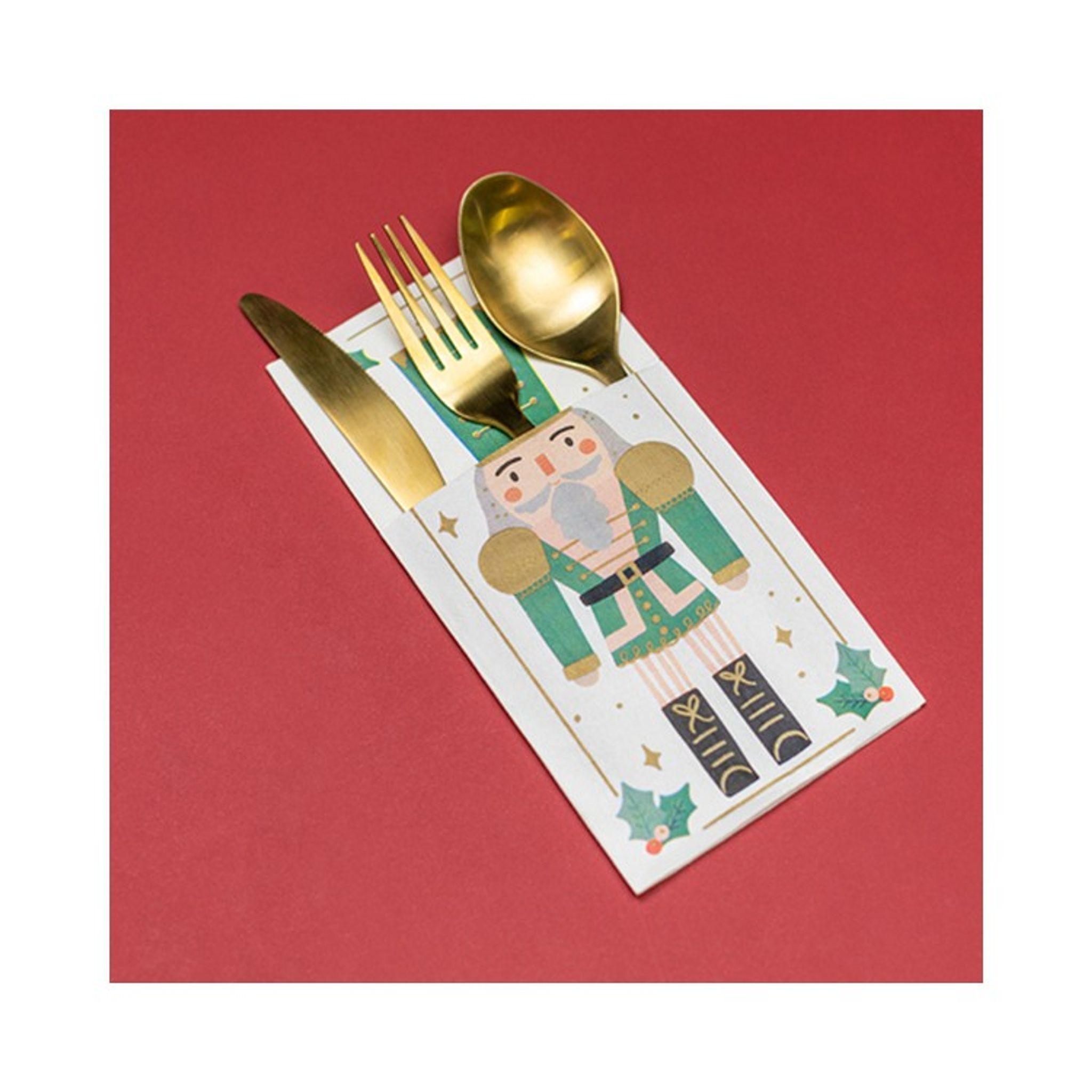 Bestickhållare i vitt papper med motiv av en nötknäppare i grönt. Fina bestickhållare som säljes i 6-pack perfekt till din dukning och ger en extra lyxig julkänsla. Storlek: 10 x 20 cm