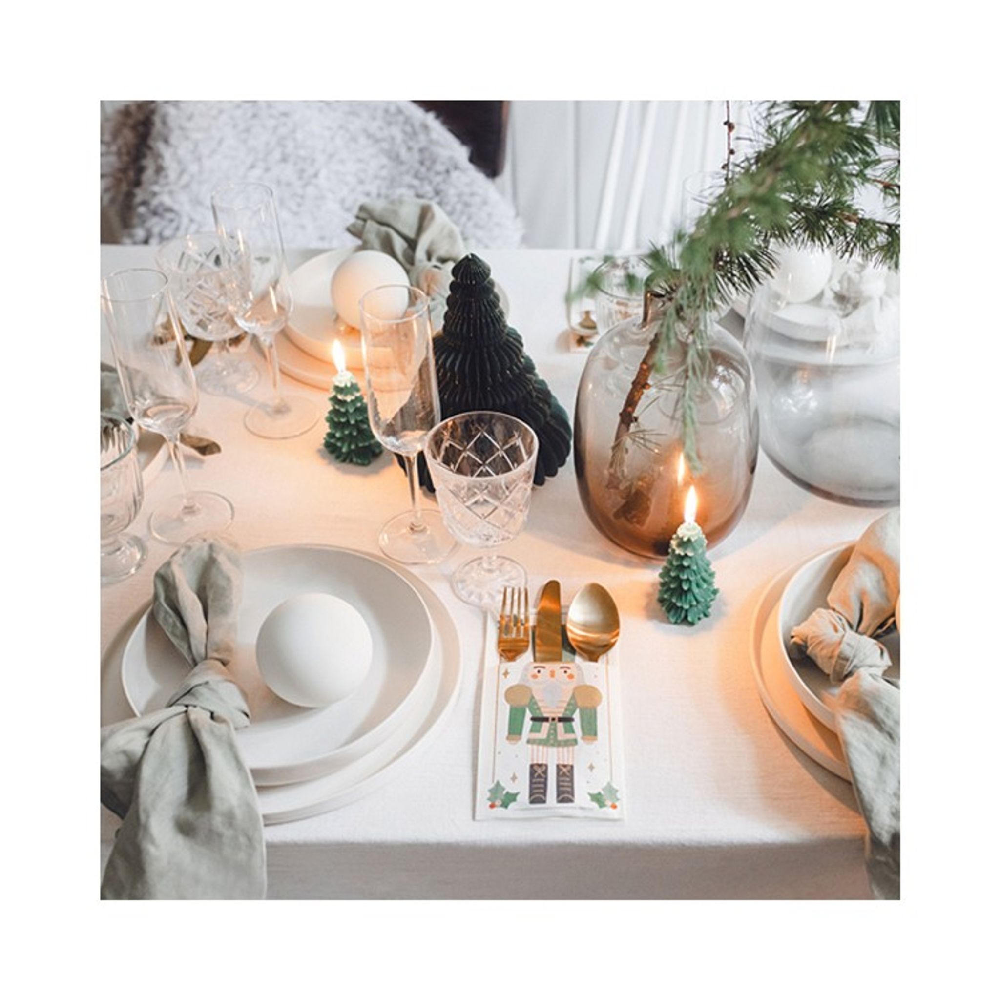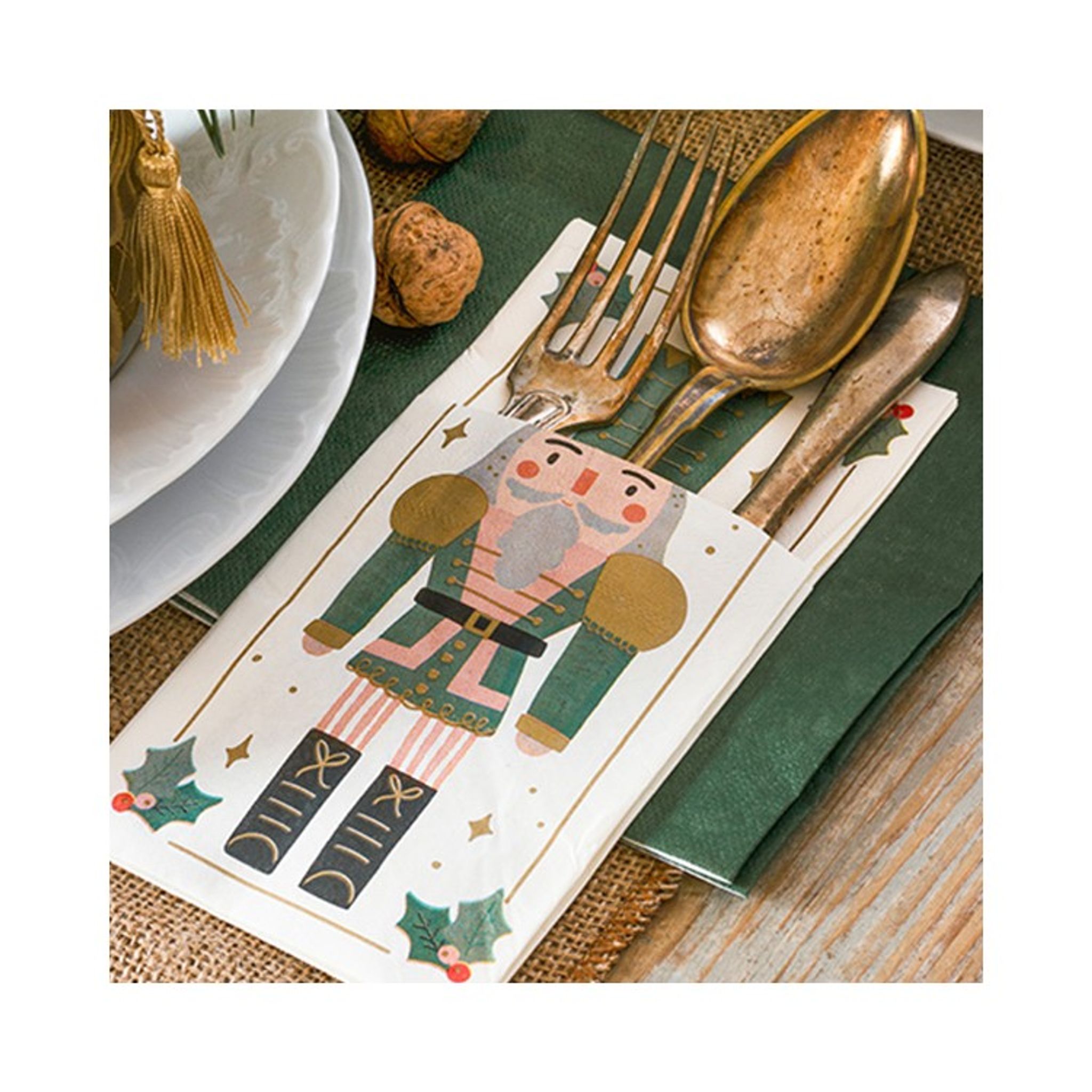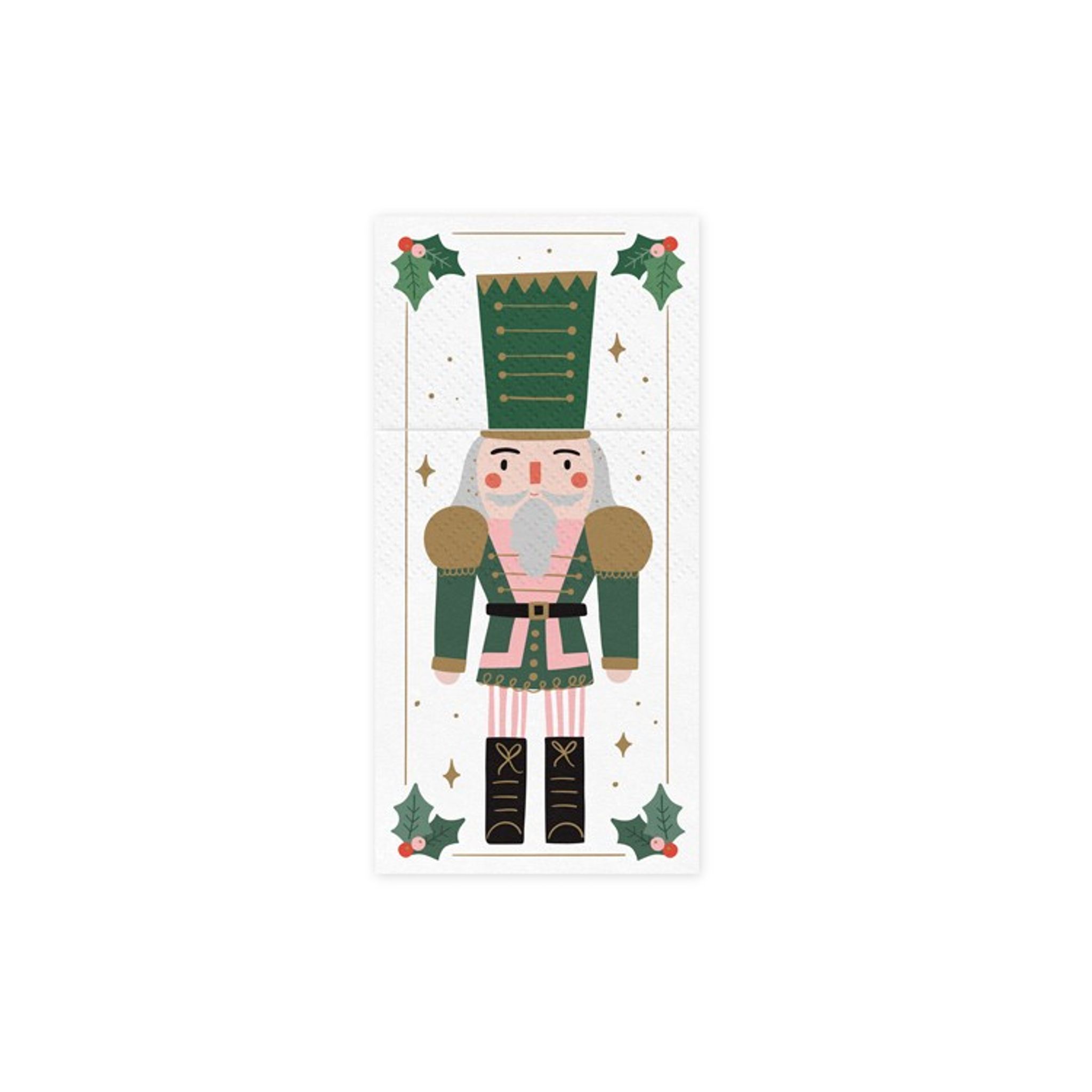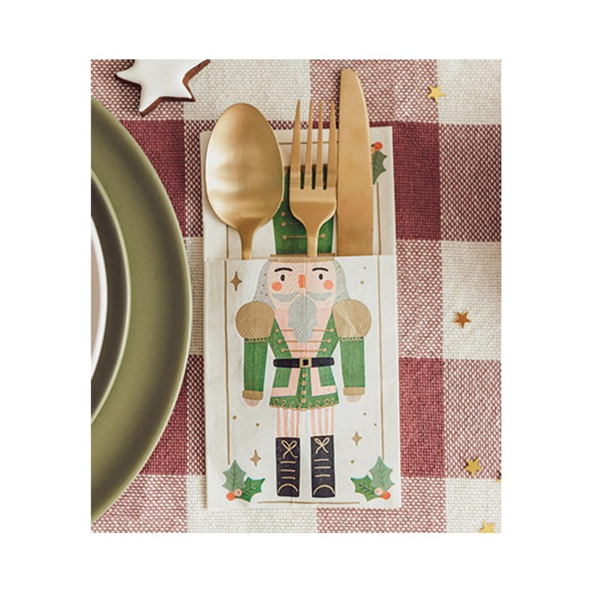 Bestickhållare i vitt papper med motiv av en nötknäppare i grönt. Fina bestickhållare som säljes i 6-pack perfekt till din dukning och ger en extra lyxig julkänsla. Storlek: 10 x 20 cm
