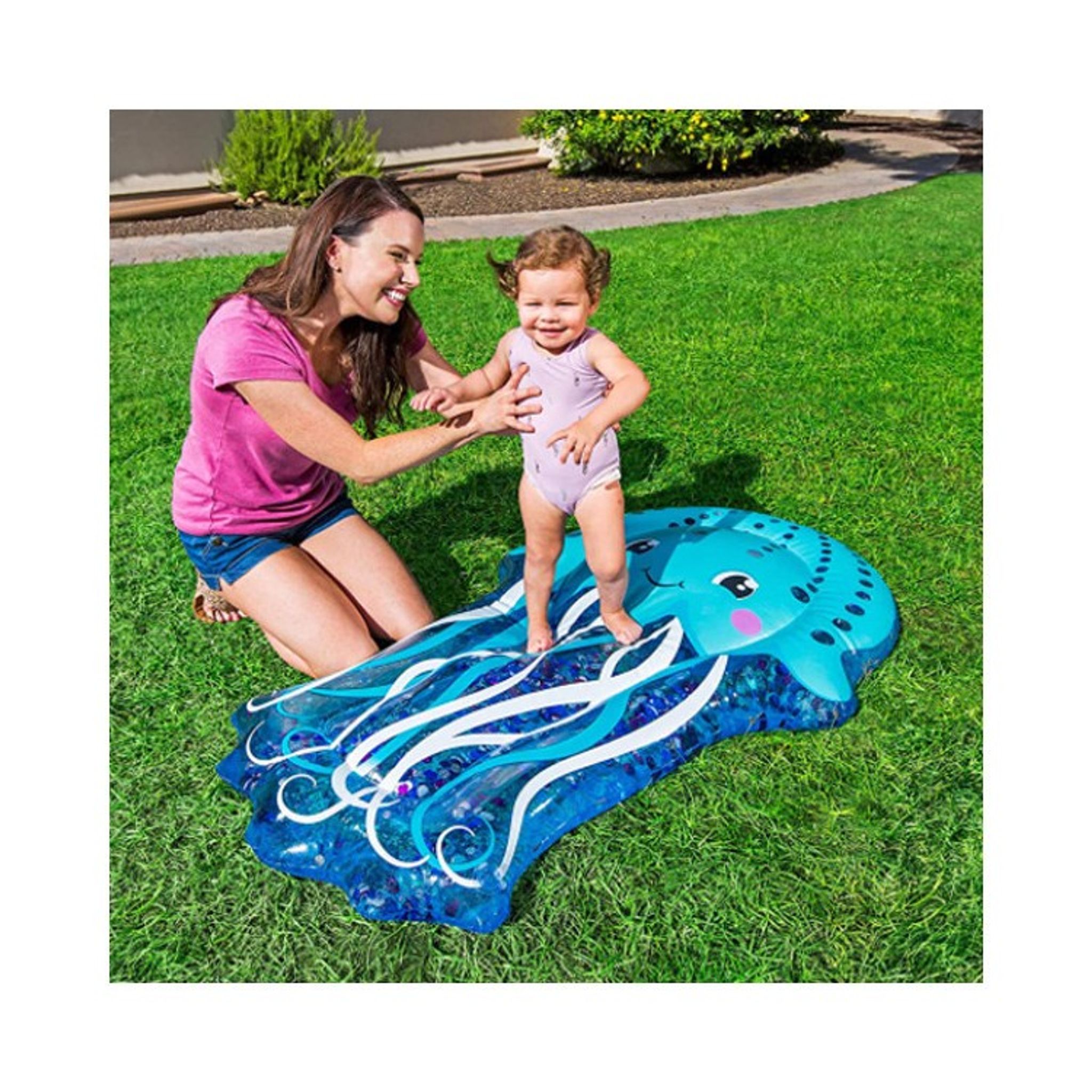 Vatten fylls genom munstycket överst på mattan för att skapa en sval yta att hoppa, studsa och leka på. Vad är bättre än en svalkande vattenmatta en varm sommardag? Perfekt för barnen att leka på, men också för att lägga sig ner och svalkas av när temperaturerna stiger!