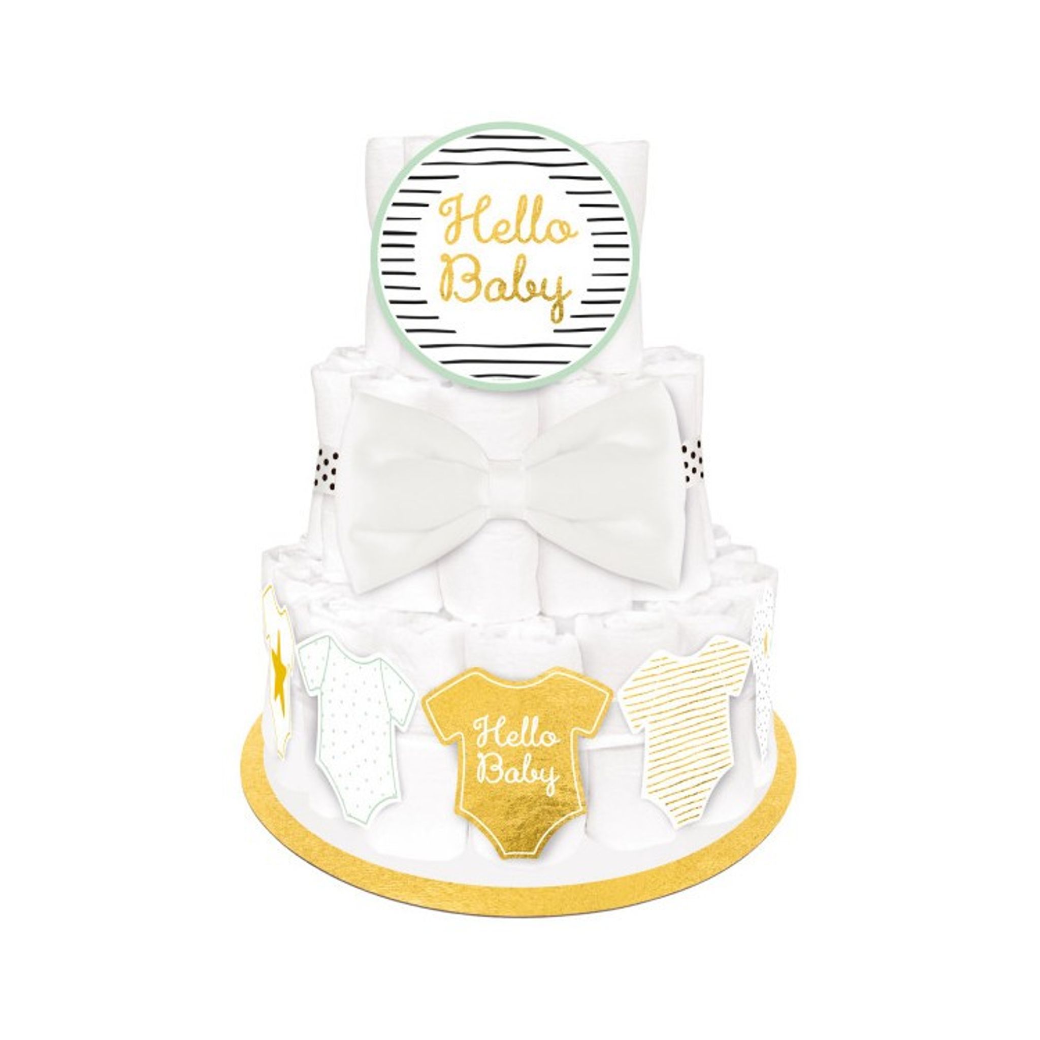 Kitet innehåller: 1st dekoration med texten "Hello baby", 1st rosettband, 1st band med babybodys i papper samt en guldig platta att ställa blöjtårtan på.