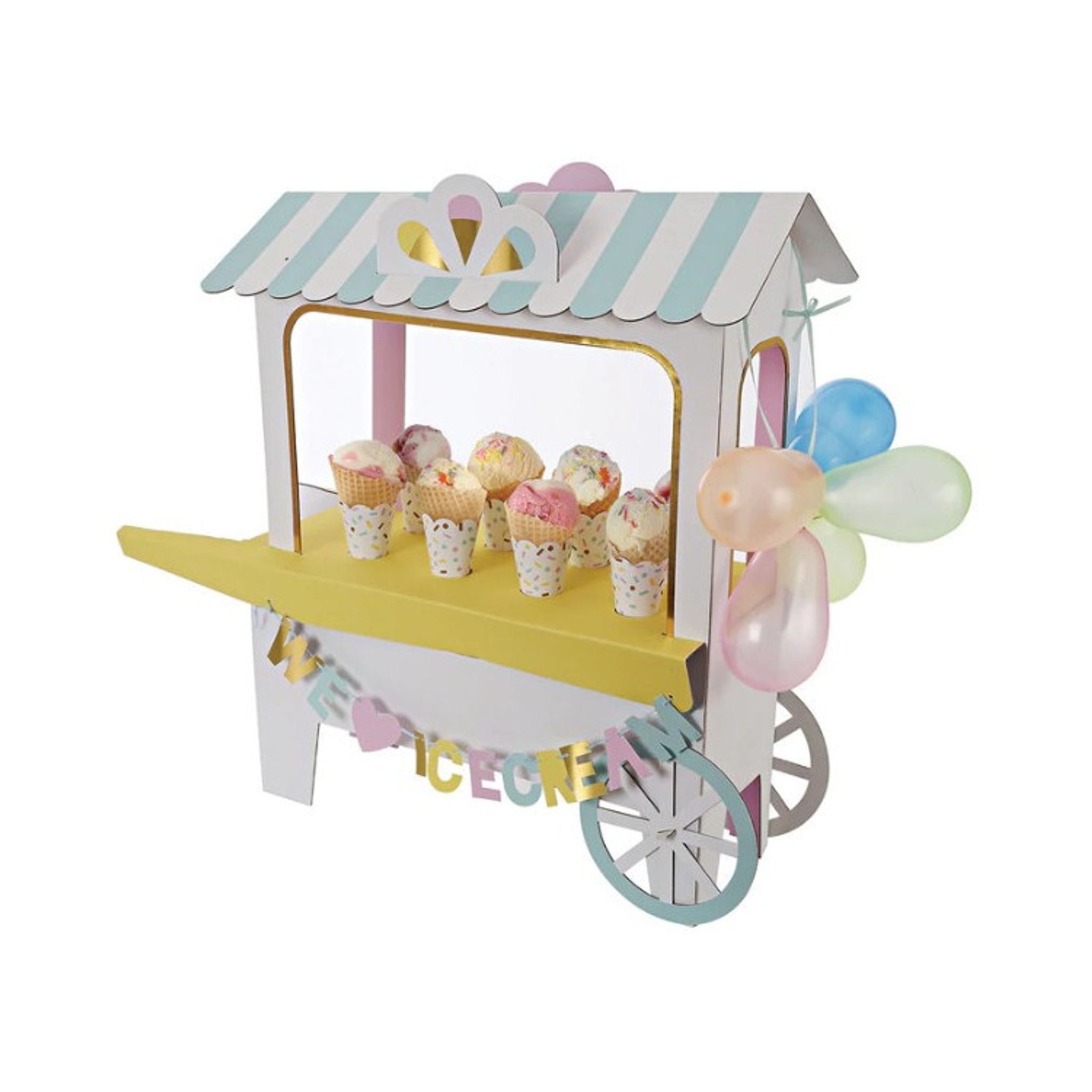 Förpackningen innehåller: 1st glassvagn i hårdpapp, 20st papper till struntar, 5st miniballonger och 1st girlang.Enkel självmontering krävs