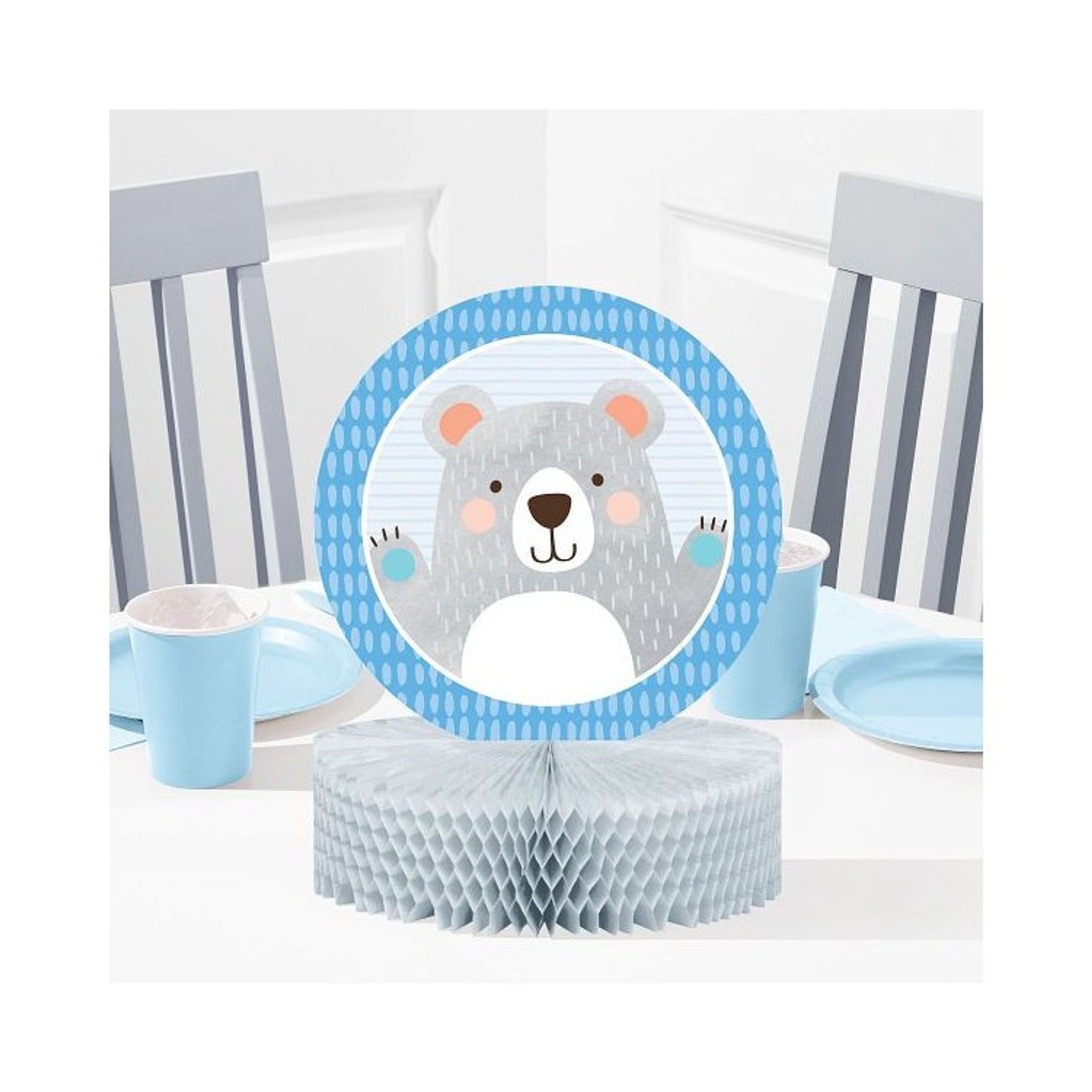 Bordsdekoration i form av söt nalle i gråa och blåa toner. Mått: ca 23x30 cm. Förpackningen innehåller en dekoration som man enkelt viker ut för att få en ståendes.