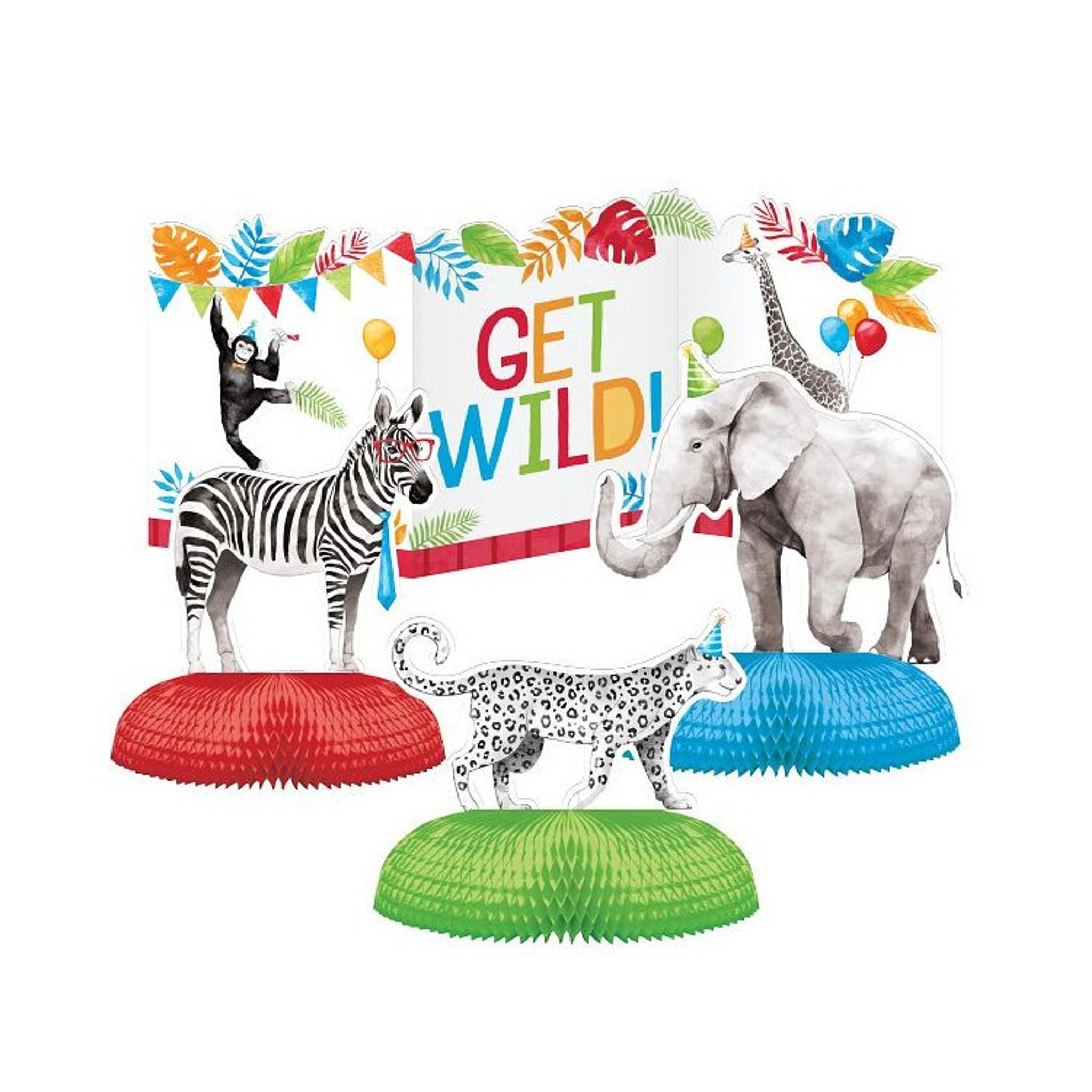 Get wild! Dessa häftiga bordsdekotationer med svart/vita djungeldjur och färgglada detaljer blir extra snygga på barnkalaset med tema djungeldjur. För vad passar bättre på kalas än söta djungeldjur med färgglada partyhattar?