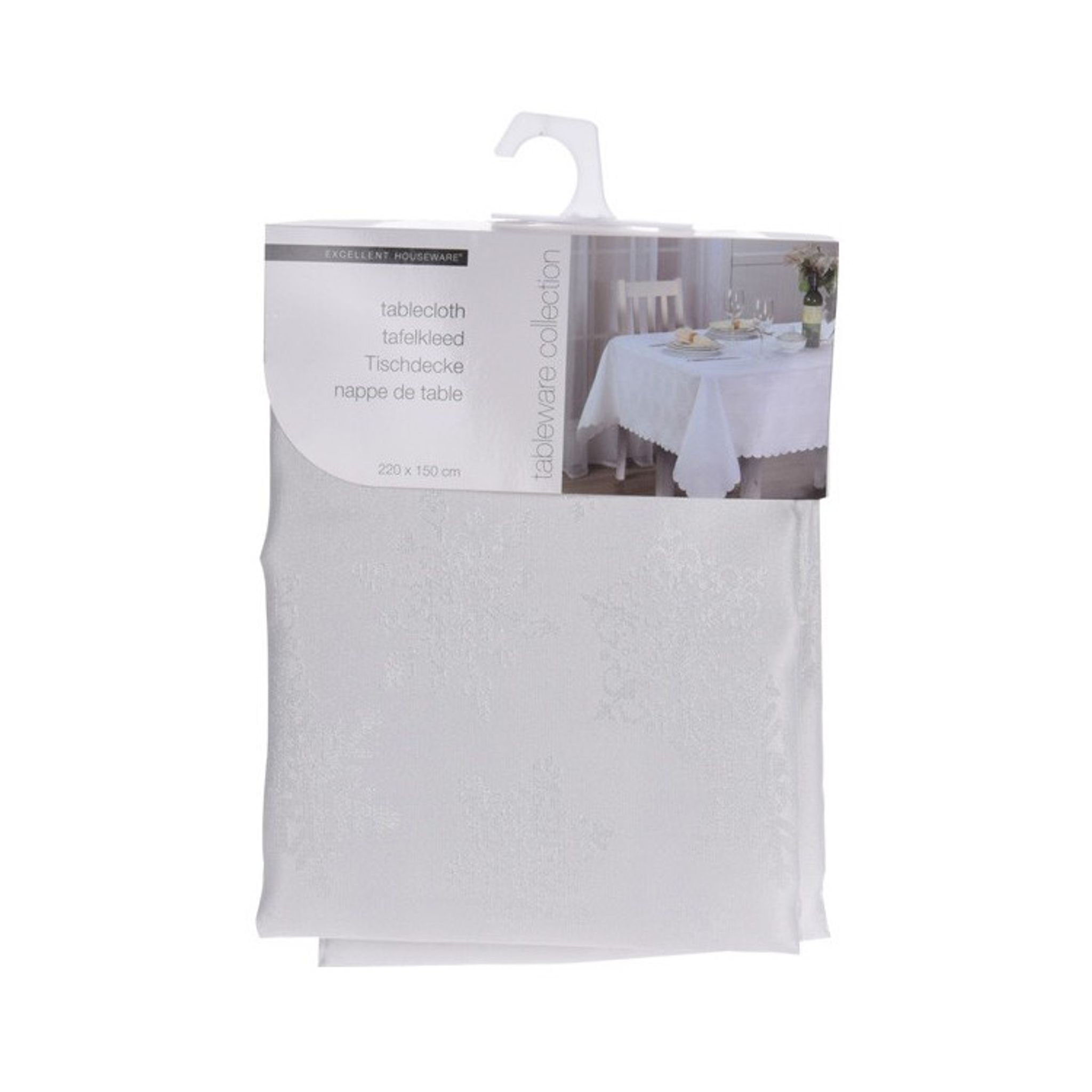 Bordsduk i vitt med glansiga snöflingor.