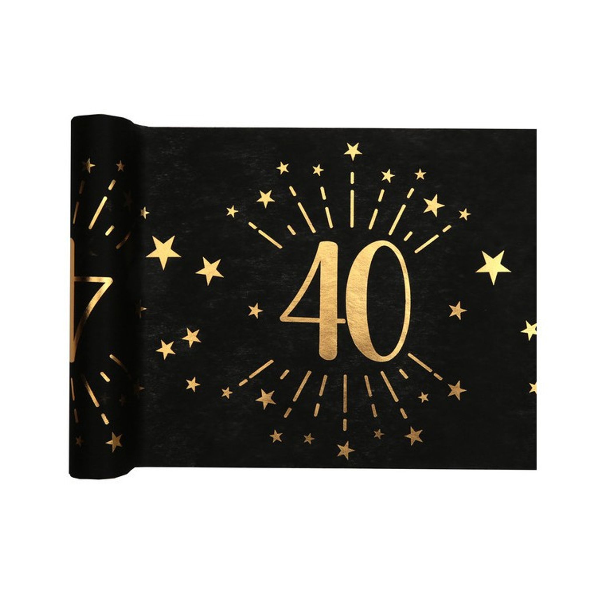 Bordslöpare i svart med guldmotiv av texten 40 samt guldiga stjärnor. Denna bordlöpare är perfekt att använda vid dukningen på 40års-festen och skapar genast en festlig känsla.