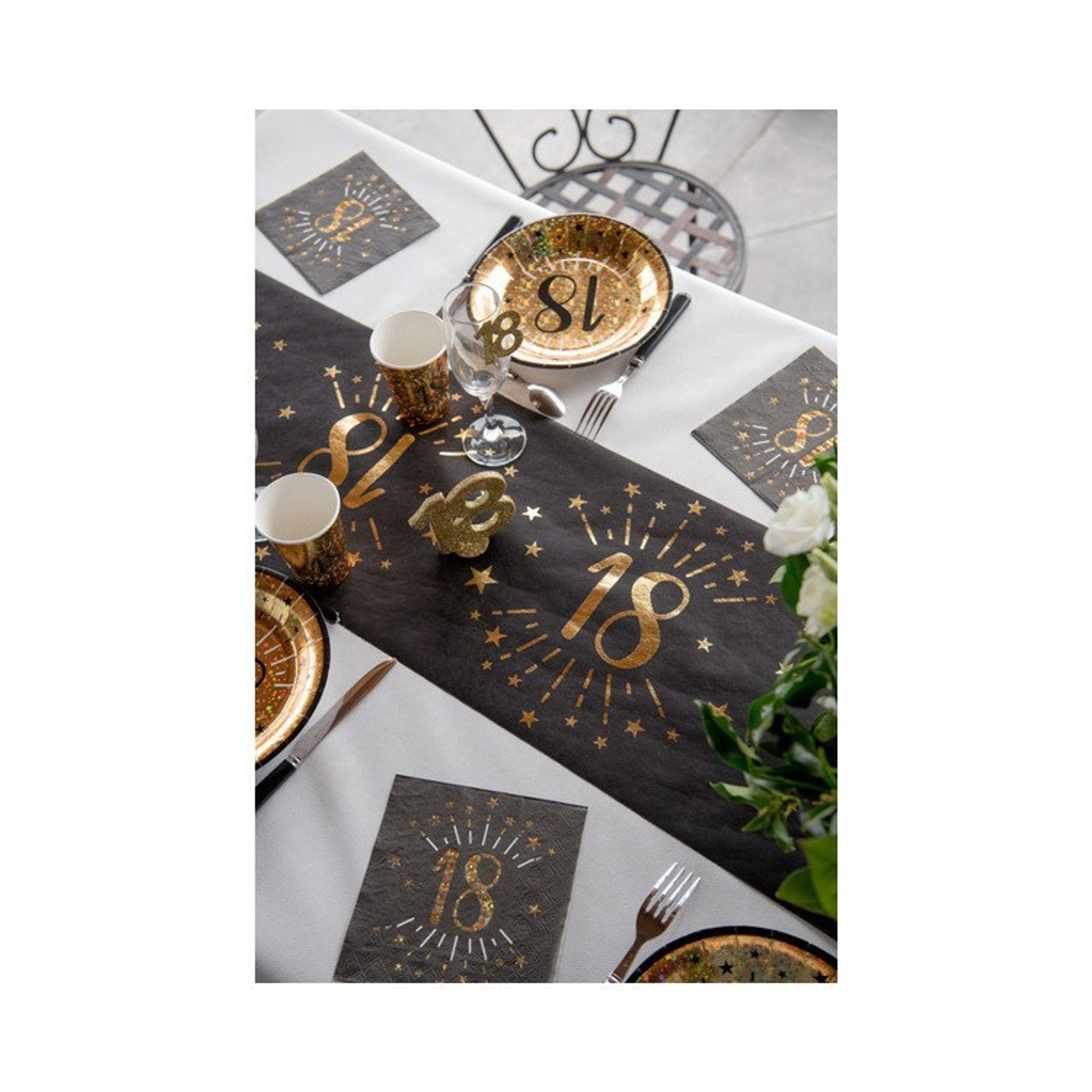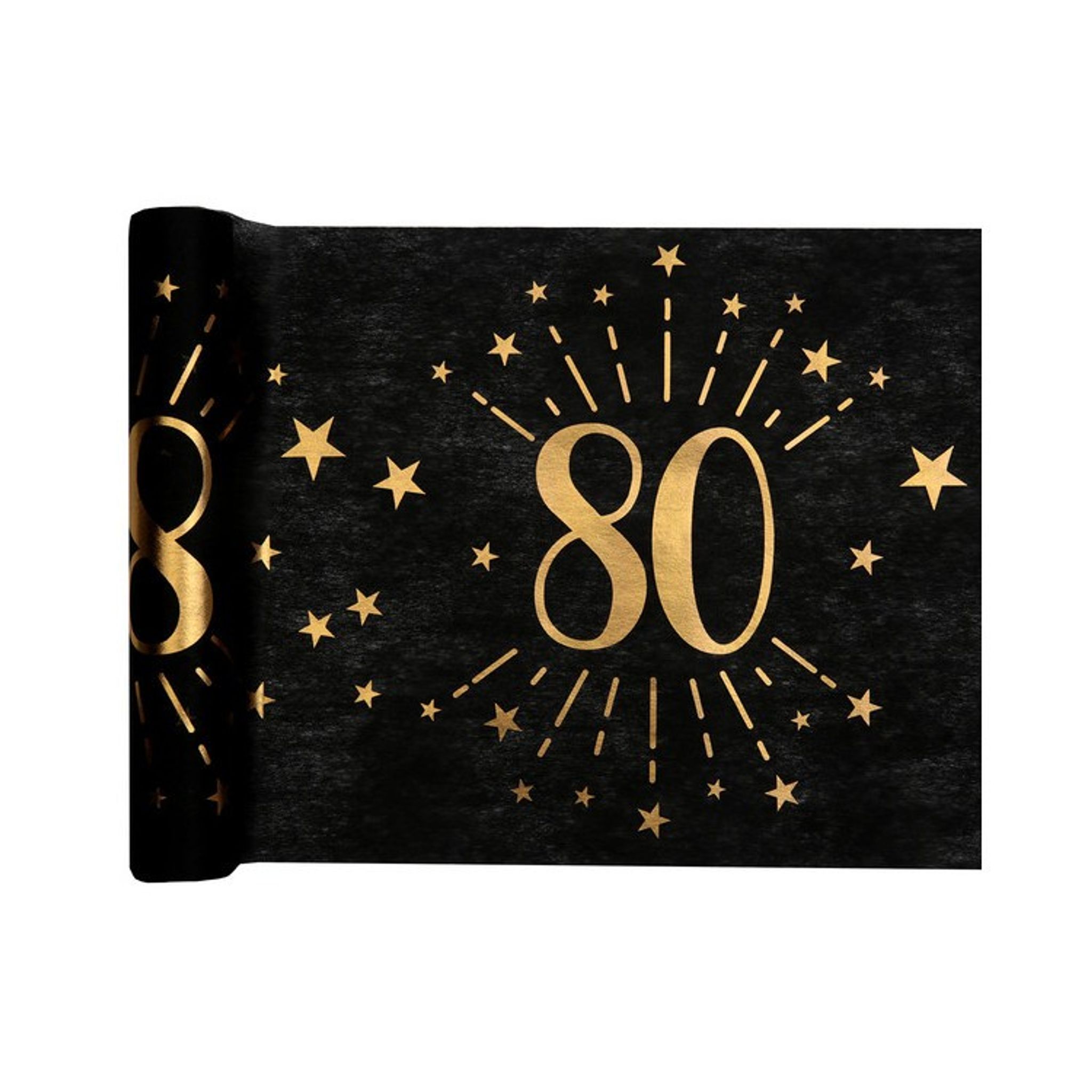 Bordslöpare i svart med guldmotiv av texten 80 samt guldiga stjärnor. Denna bordlöpare är perfekt att använda vid dukningen på 80års-festen och skapar genast en festlig känsla.