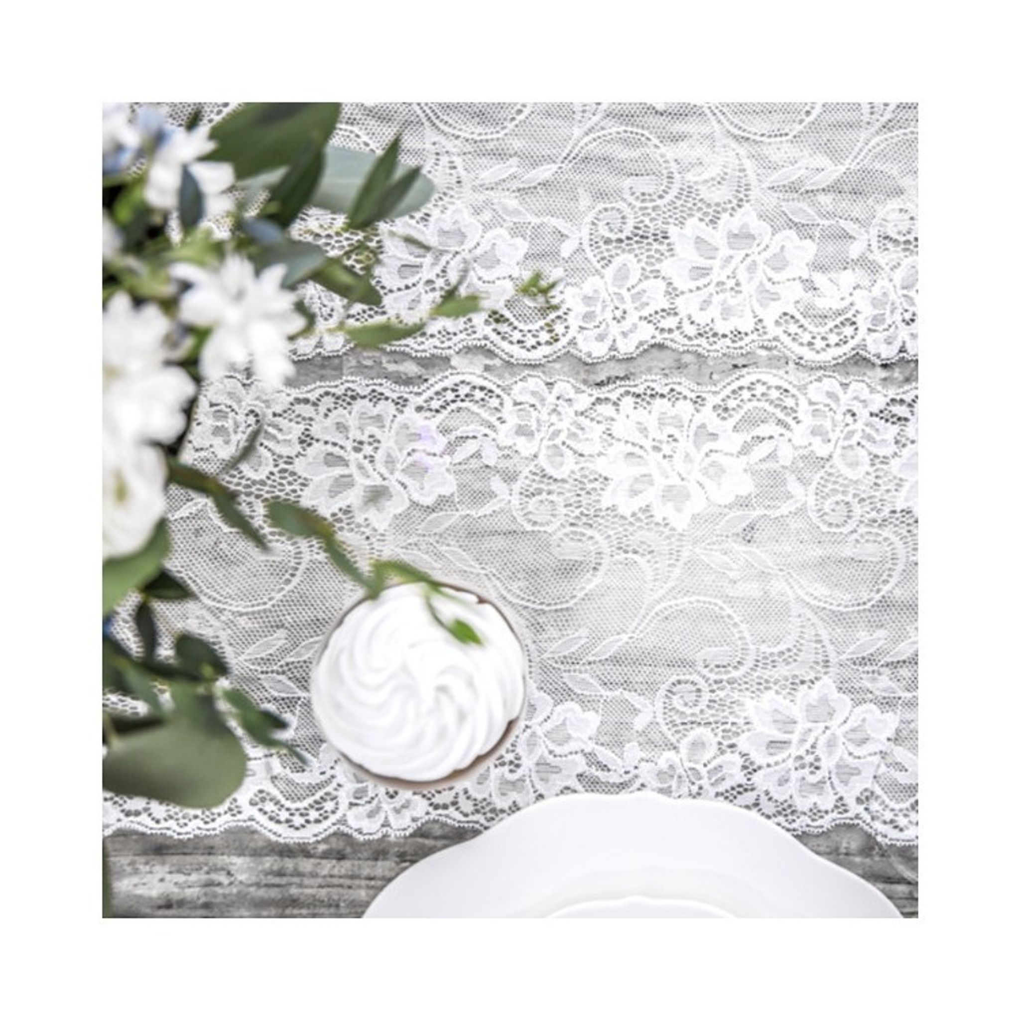 Vit bordslöpare i spets att använda som fin dekoration till bröllop och fest. Perfekt när du vill skapa en romantisk känsla på dukningen. Bordslöparen mäter 9 meter och har en bredd på 18 cm.