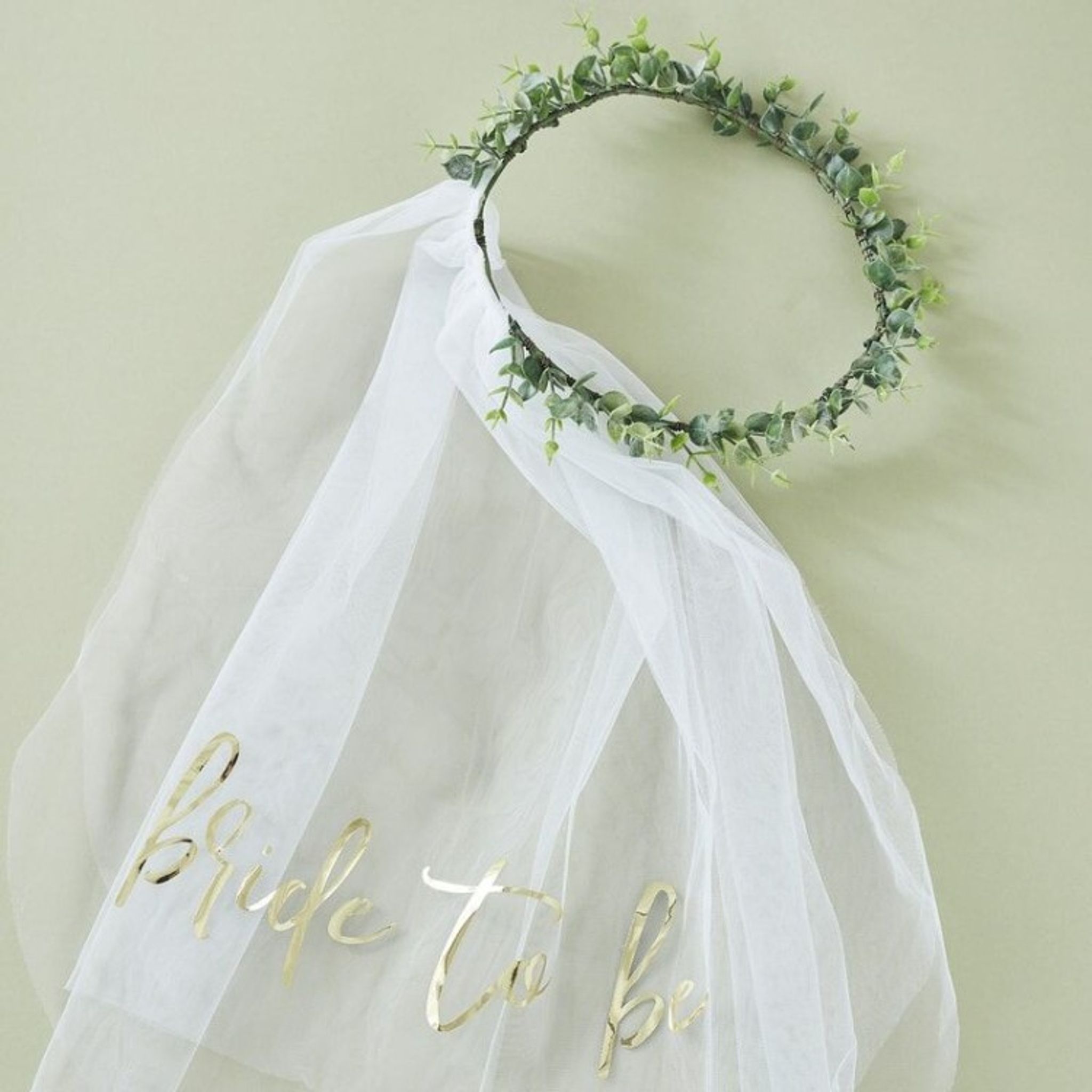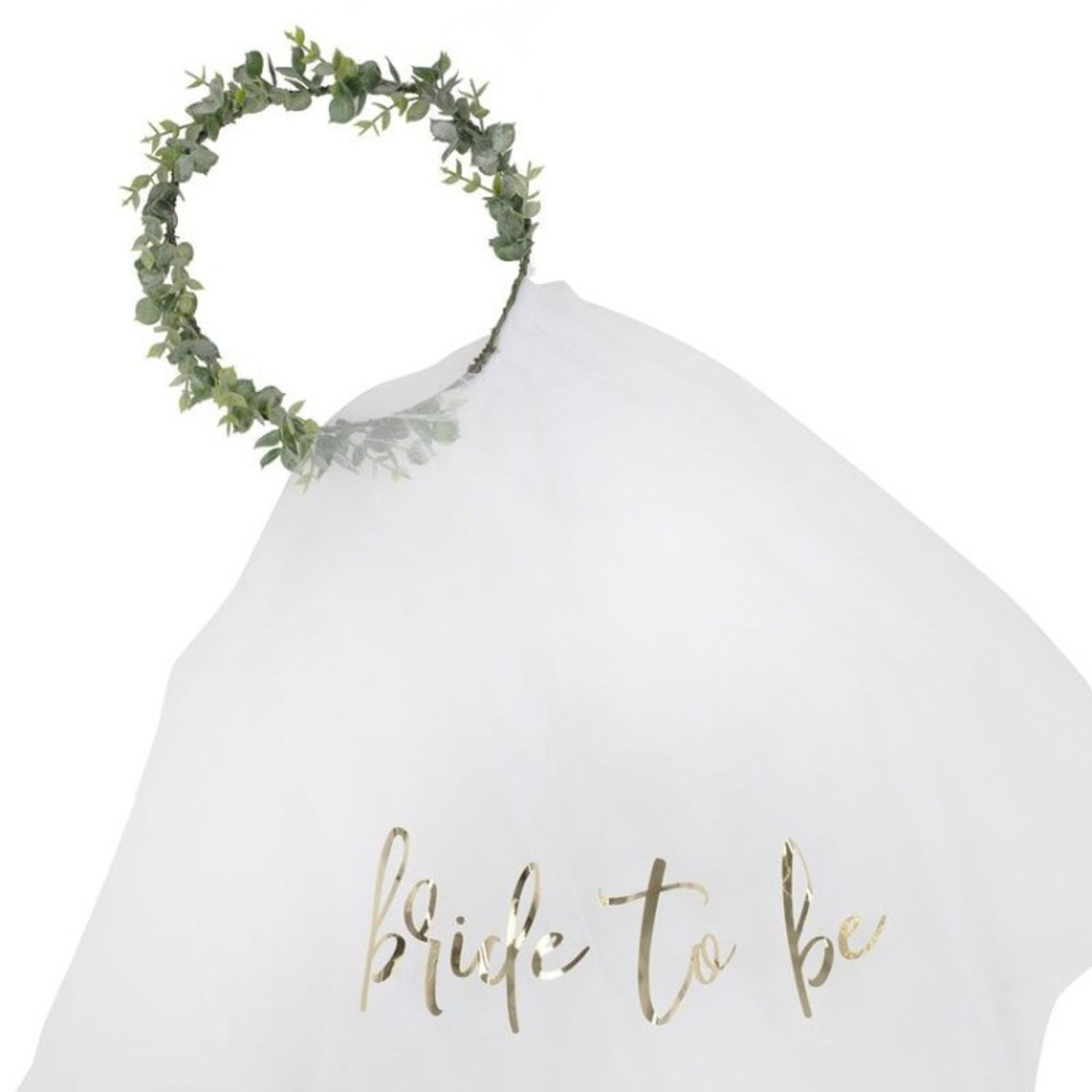 Se till att den vackra blivande bruden firar med stil med denna fantastiska eukalyptuskrona med slöja. Kronan har en härlig vit slöja med Bride to Be guldfolierande text som säkert kommer att bli älskad av alla!