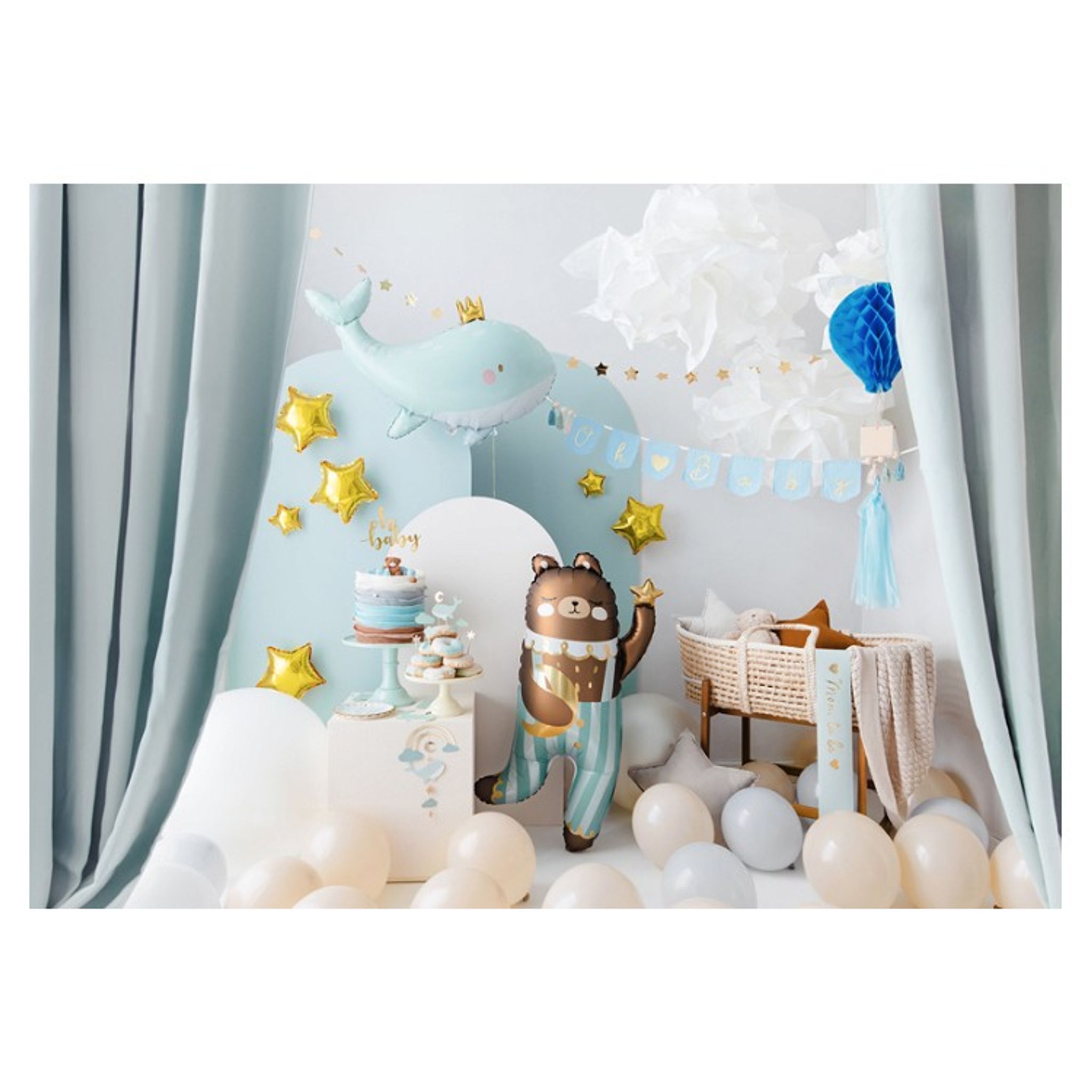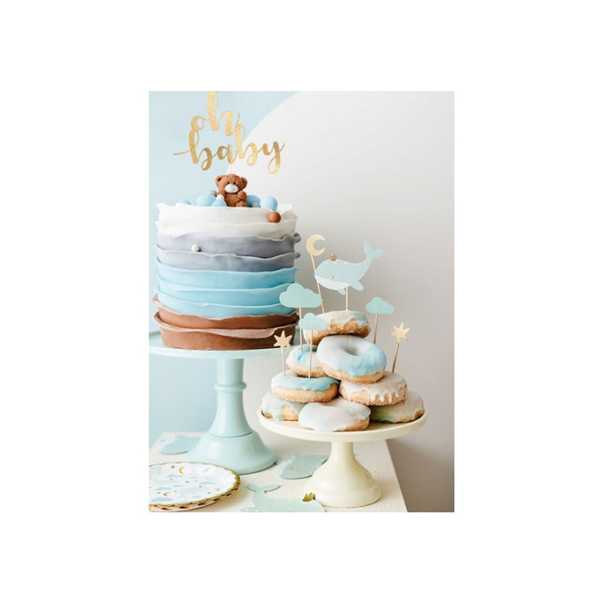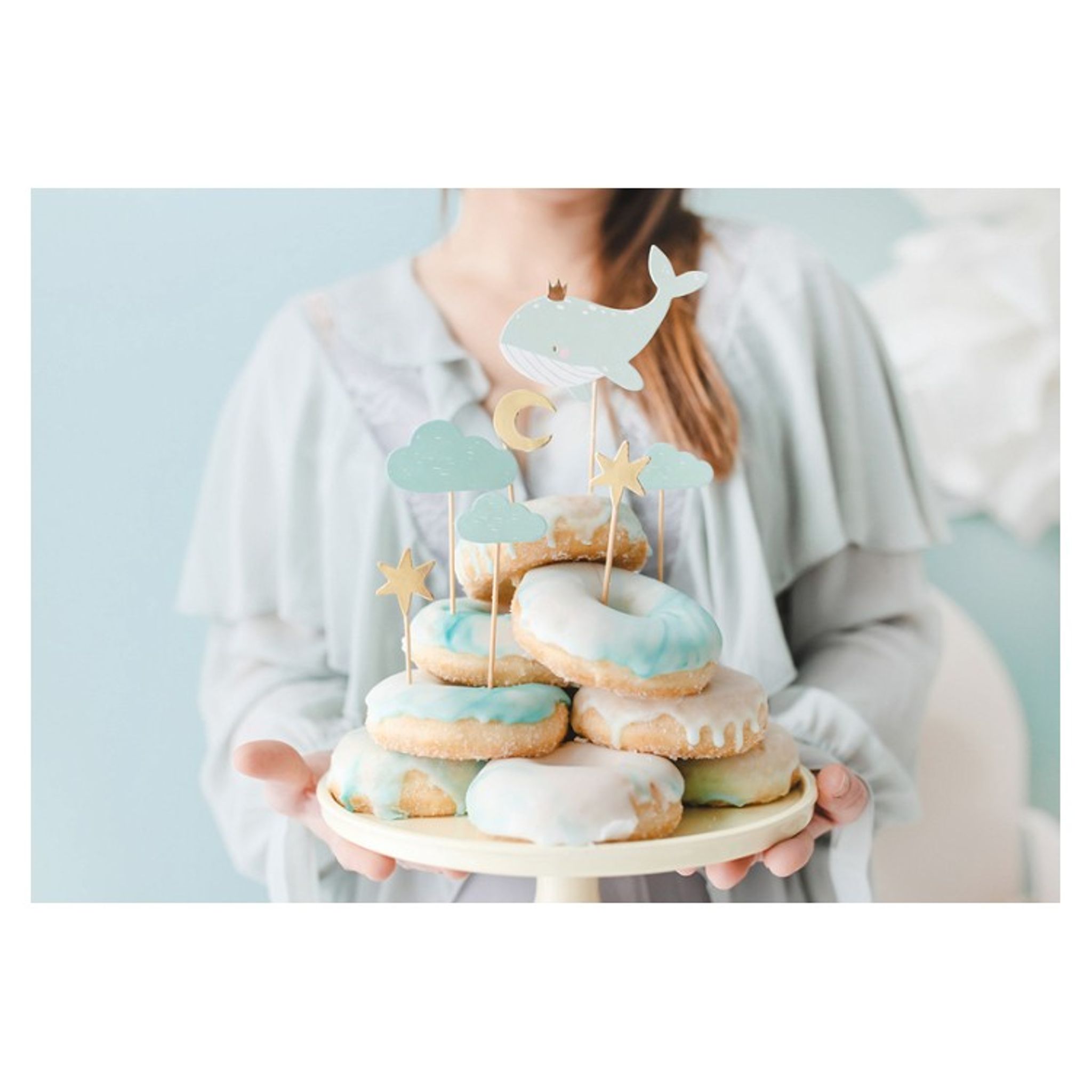Dekorera cup cakes, tårtan eller andra bakverk med dessa bedårande cake toppers i form av blåval, måne, stjärnor och fina moln i blågrönt och guld. Passar utmärkt till Baby shower, dop eller barnkalas.