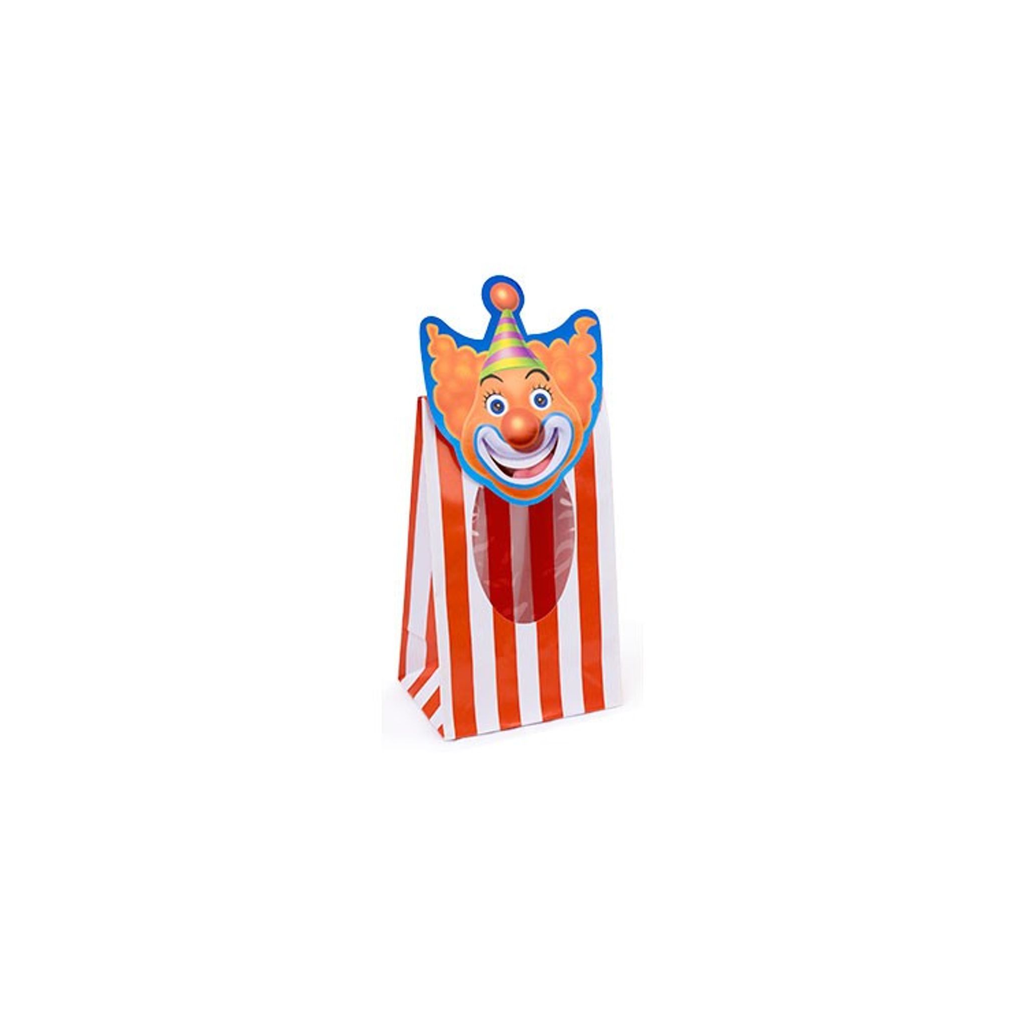 8 st små underbart söta godispåsar med clown-motiv, av papper och med fönster. Storlek 20,95 x 8,25 x 6 cm