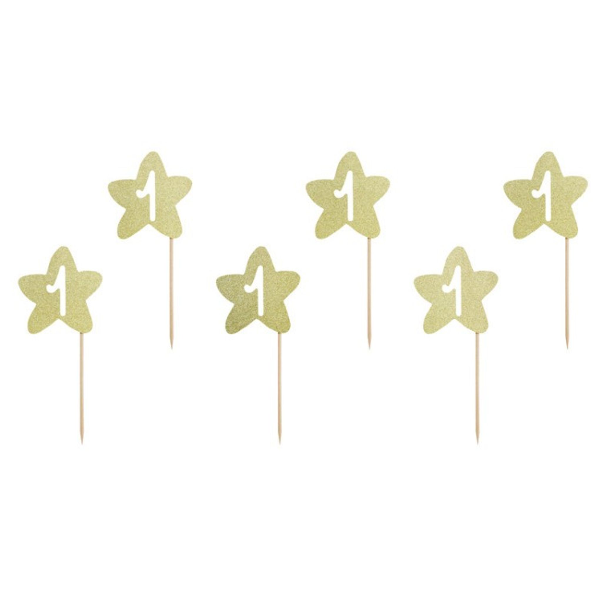 Fira barnets absolut första födelsedag med läckra cupcakes som du toppar med passande 1st birthday cupcake toppers. Dessa toppers är i form av guldglittriga stjärnor med en utskuren 1:a. Dekorativa när du vill fira flickan eller pojken som fyller 1 år.