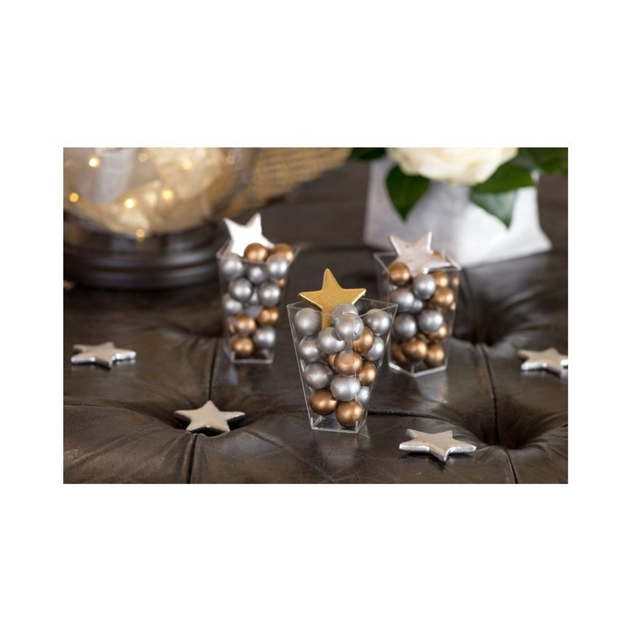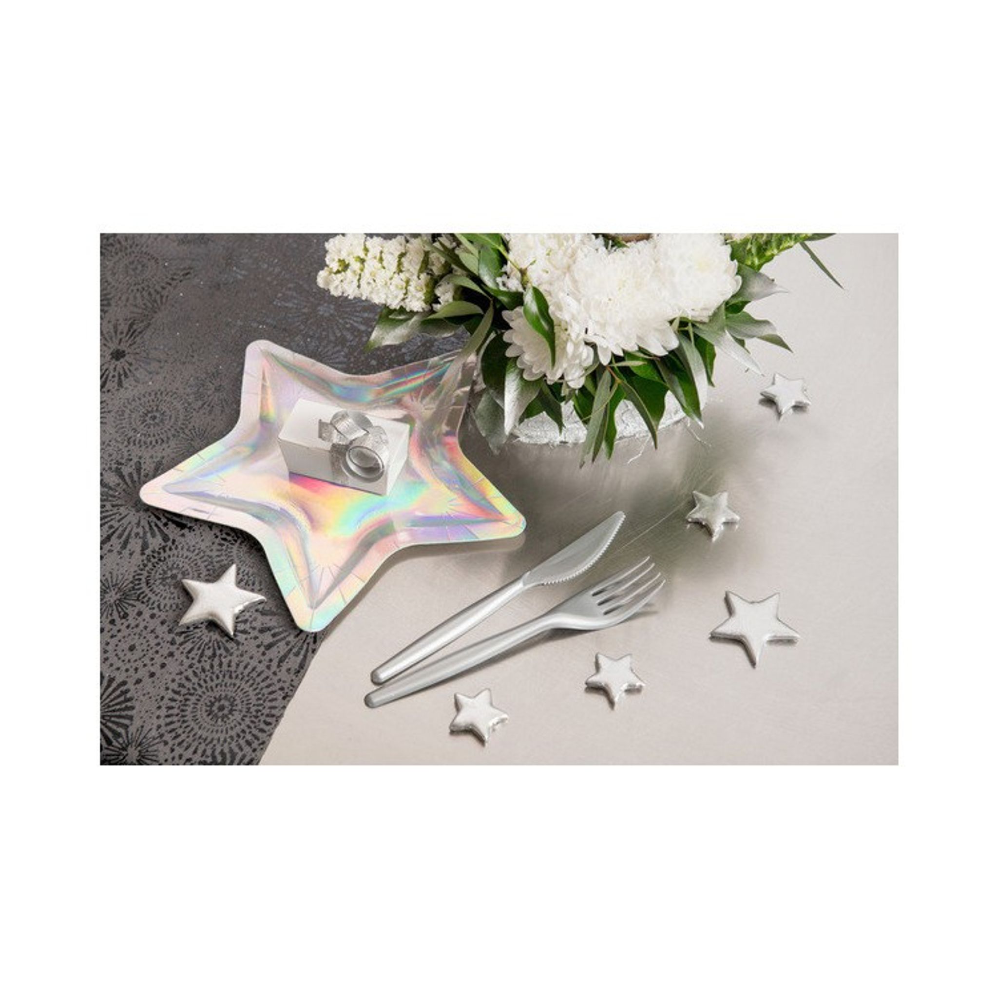 Stjärnor i silver att dekorera med vid dukningen. Förpackningen innehåller 6 st stjärnor i två olika storlekar, tre st av varje storlek. Perfekt att använda vid alla festliga tillfällen, allt ifrån rymdkalaset till bröllopet.