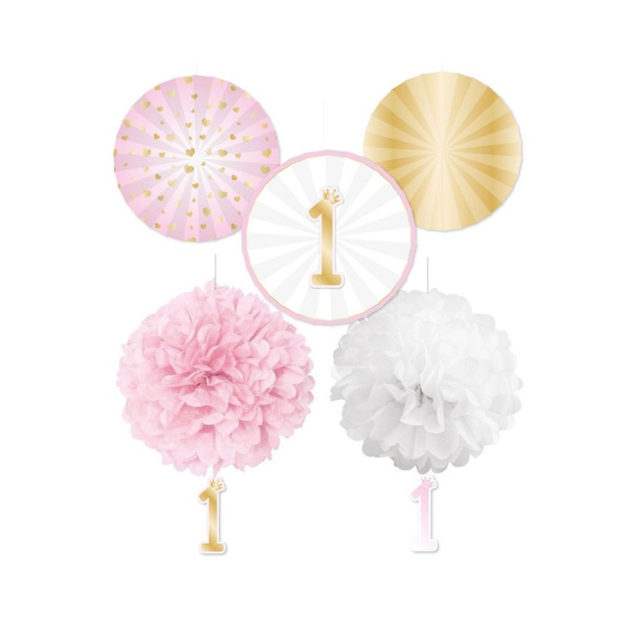 Det ultimata dekorationskitet till 1 års-kalaset. Här får du både pom poms och dekorationmånar i rosam vitt och guld. Pom pomsen har även siffran 1 hängandes från dem.