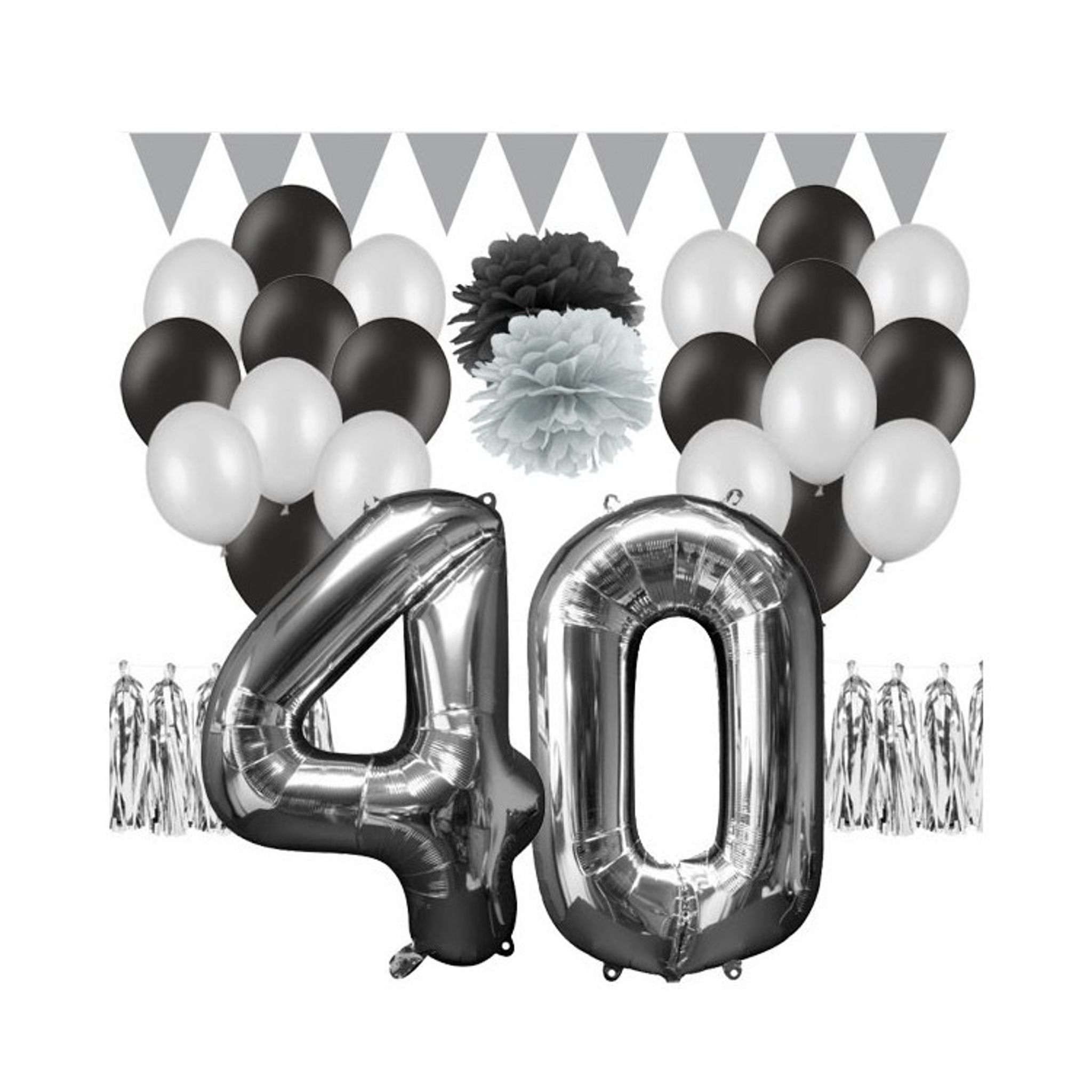 Bjud in till ett 40 års-kalas och dekorera snyggt med hjälp av våra folieballonger med siffror och andra snygga festdekorationer. Här har vi plockat ihop ett färdigt festkit med mixade dekorationer i silver och svart som på ett enkelt och snyggt sätt fixar 40-årsfesten! Paketet är ihopsatt med populära produkter som gör det enkelt att dekorera till en av de största dagarna på året. Färgerna svart och silver passar fint ihop och matchar till många av våra kalasartiklar. Vi hjälper dig med ett baspaket som vi tycker är ett måste för en snygg dukning.