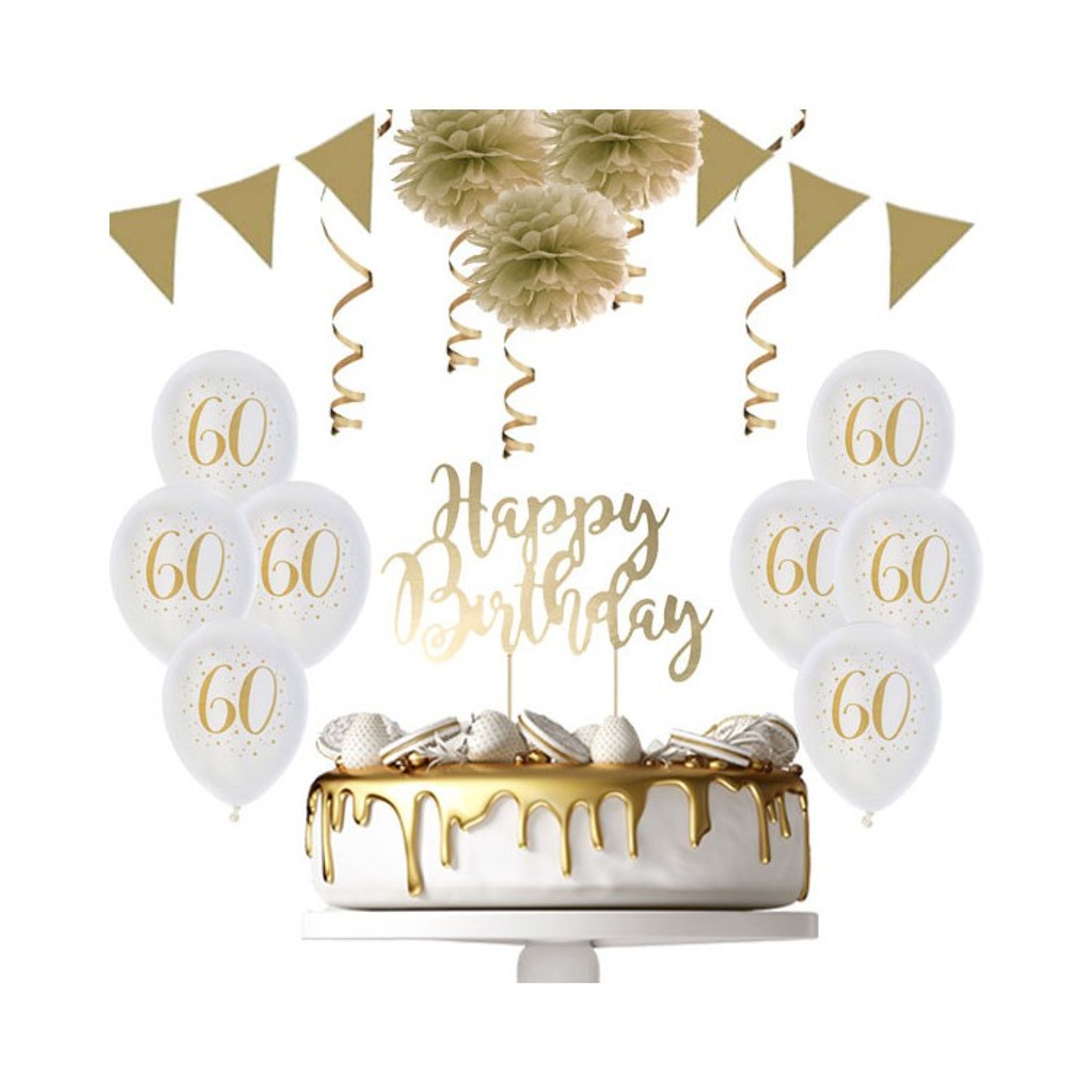 Fyller du eller någon kär familjemedlem/vän hela 60 år? Oavsett om det är en mysig middag eller större fest blir den här kombinationen av ballonger, pom poms, serpentin, tårtdekoration och vimpel utmärkt!