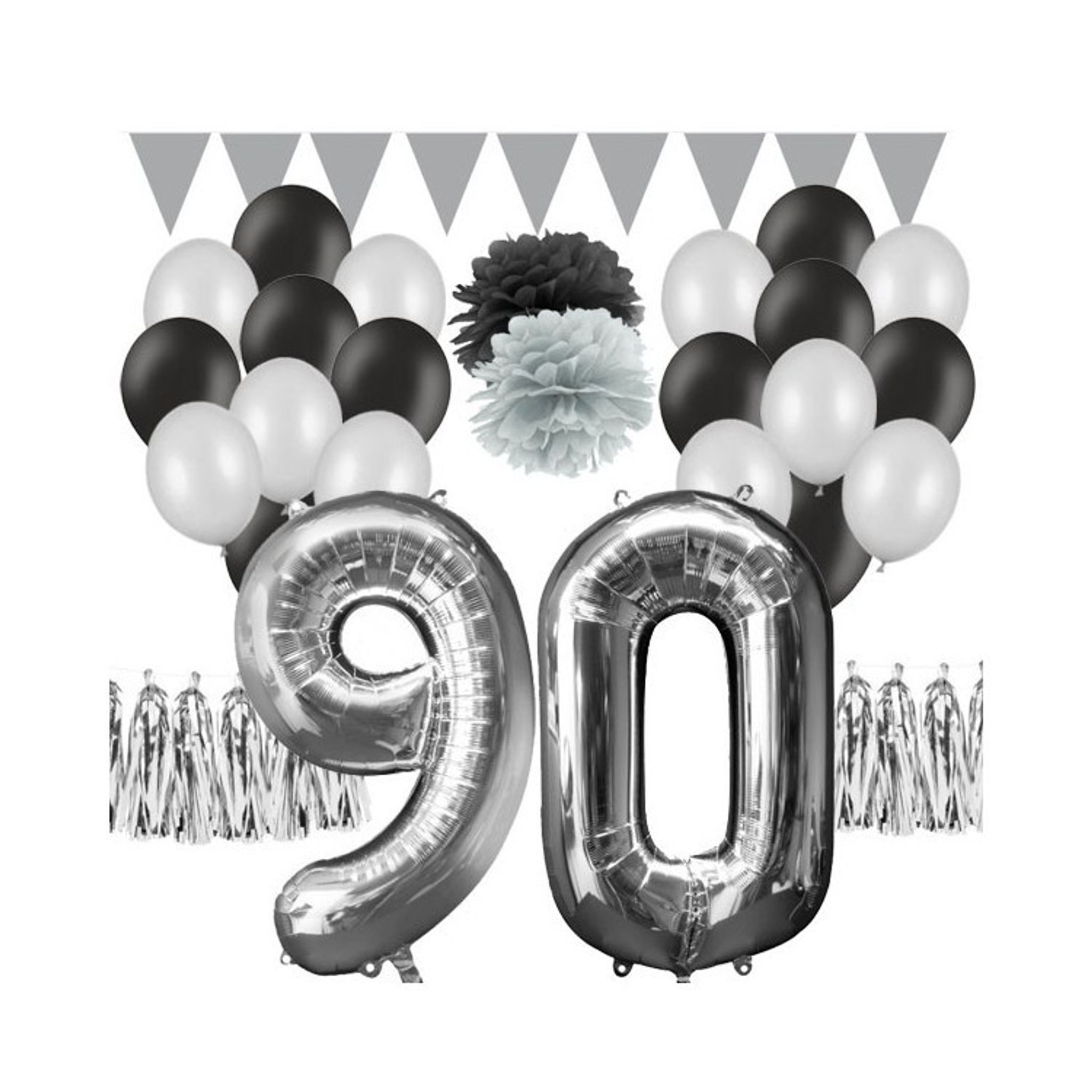 Bjud in till ett 90 års-kalas och dekorera snyggt med hjälp av våra folieballonger med siffror och andra snygga festdekorationer. Här har vi plockat ihop ett färdigt festkit med mixade dekorationer i silver och svart som på ett enkelt och snyggt sätt fixar 90-årsfesten! Paketet är ihopsatt med populära produkter som gör det enkelt att dekorera till en av de största dagarna på året. Färgerna svart och silver passar fint ihop och matchar till många av våra kalasartiklar. Vi hjälper dig med ett baspaket som vi tycker är ett måste för en snygg dukning.
