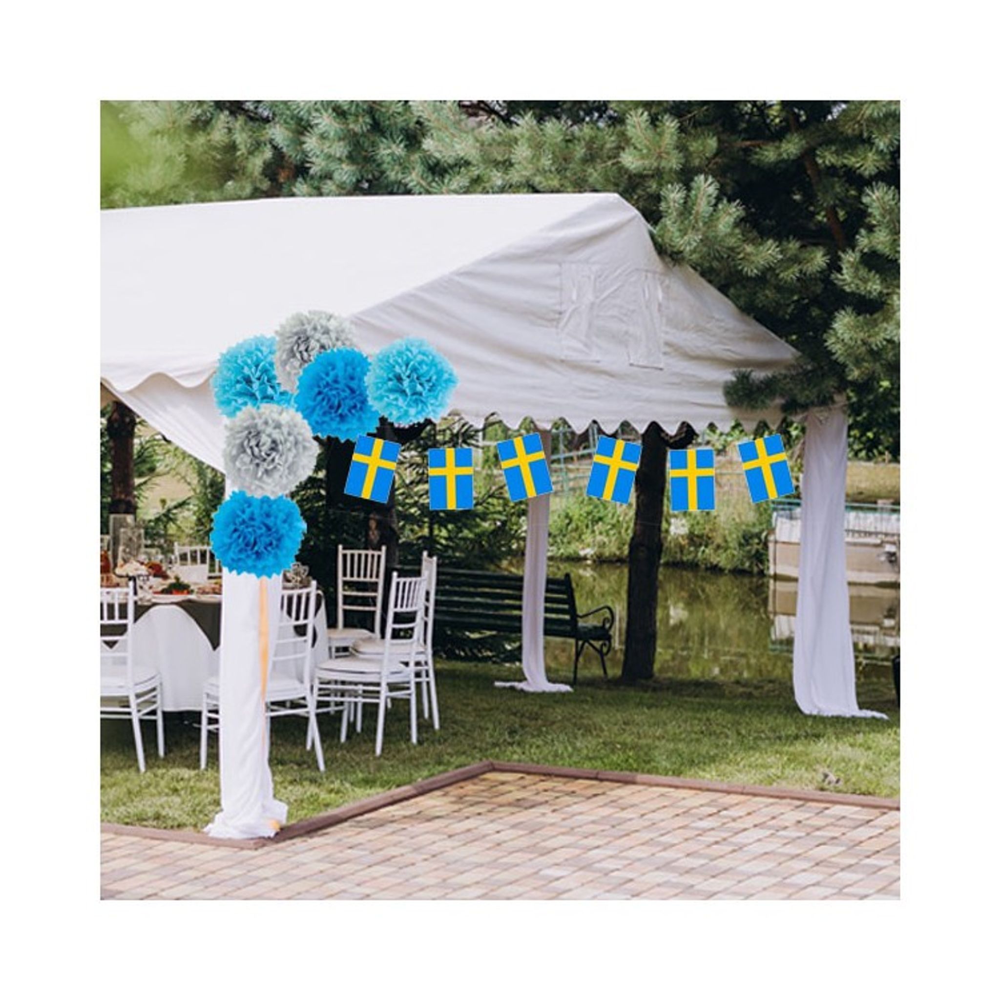 Student eller Midsommar? Det här härliga kitet med svenska flaggan vimpel och läckra pom poms är utmärkt att dekorera med på exempelvis partytältet eller inomhus vid buffébordet.