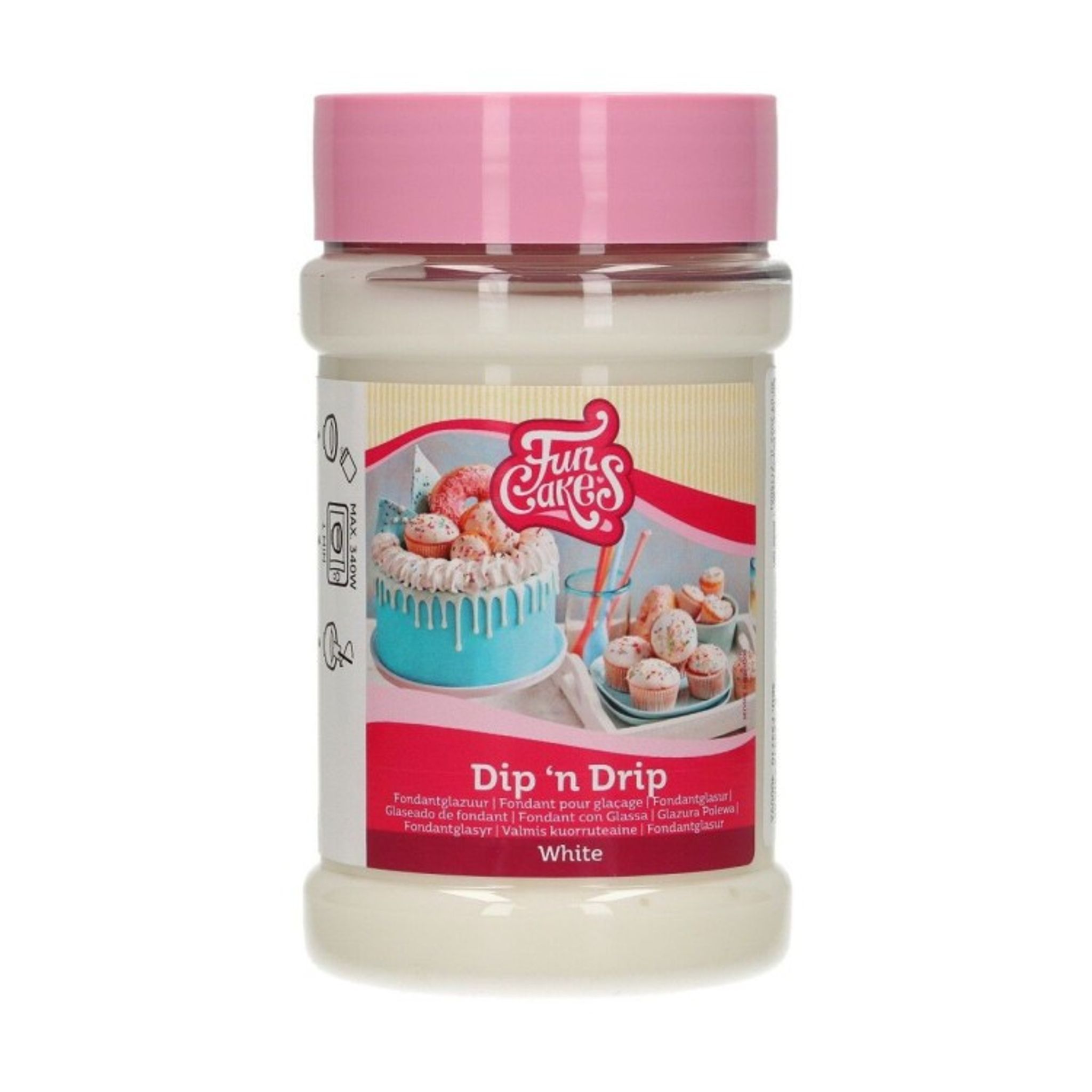 Dip 'n Drip är också känd som vit fondantglasyr eller smält fondant. Med denna vita glasyr kan du ge dina muffins eller kakor en blank glasyr som härdar. Smält helt enkelt Dip 'n Drip i mikrovågsugnen och doppa dina muffin och donuts i glasyren eller häll den över din tårta. Glasyren härdar ut och är lätt att färga i önskad färg. Det kan också användas för att lägga till några accenter till dina dekorationer med en spritspåse.