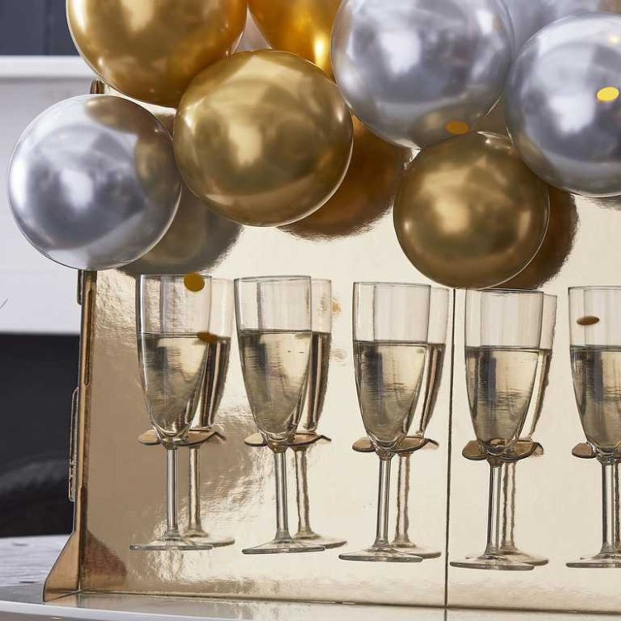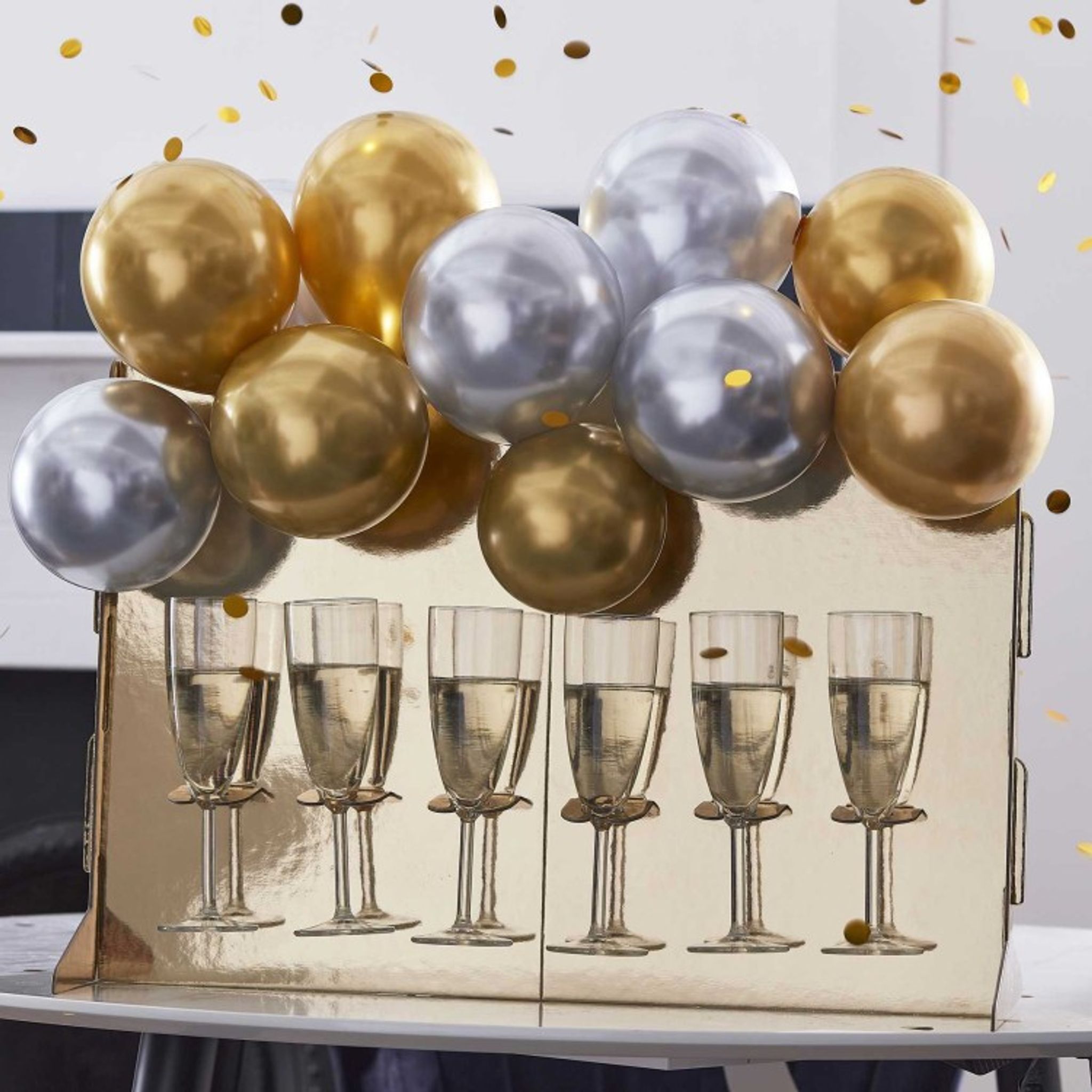 Gör din alldeles egna drinkhörna med detta fantastiska dryckesställ med ballonger i guld och silver.