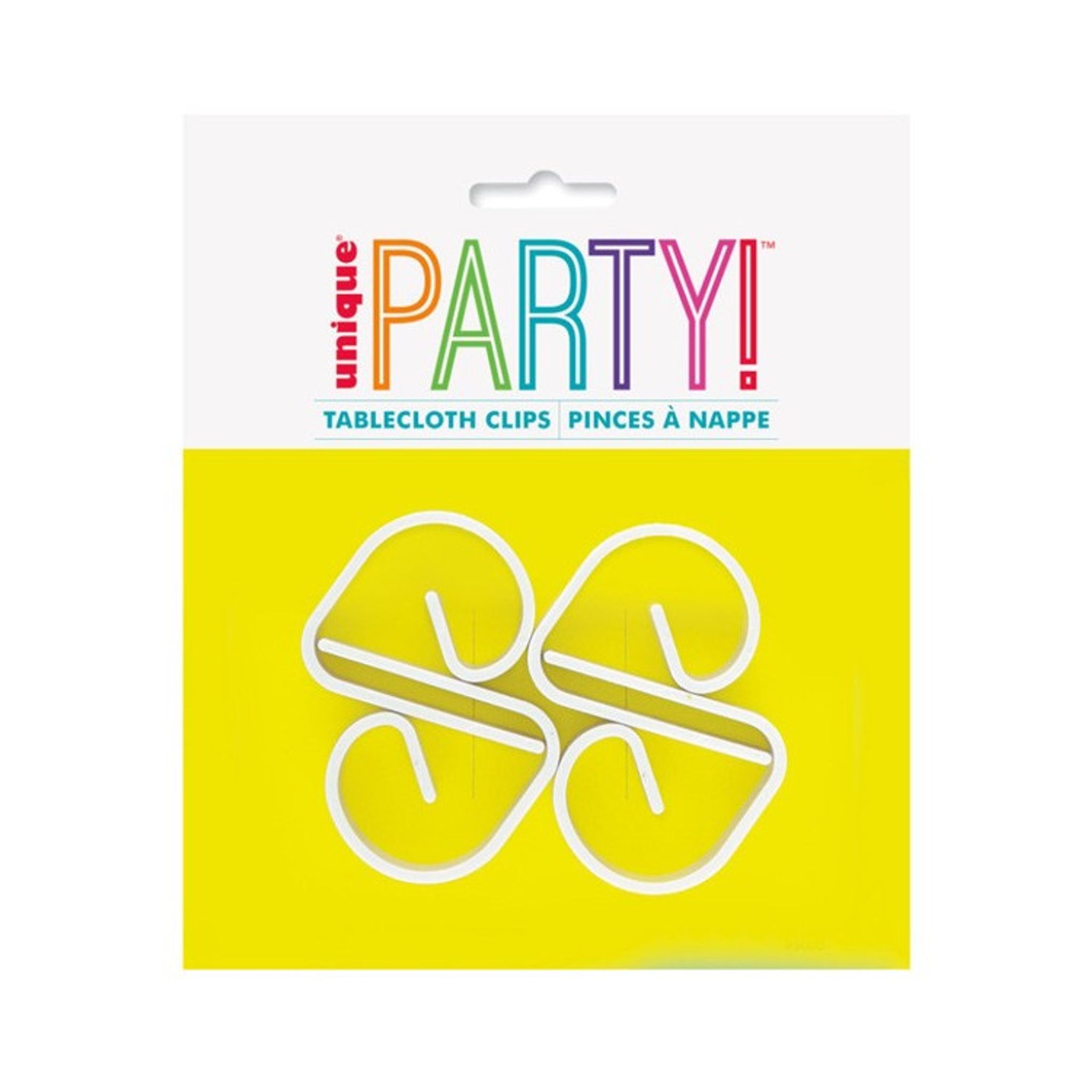 En förpackning innehåller 4 stycken vita klämmor. Klämmorna är tillverkade i hårdplast och är helt perfekta att fästa duken med speciellt om man anordnar kalaset utomhus. Klämmorna är anpassade för att kunna passa dom allra flesta bord.