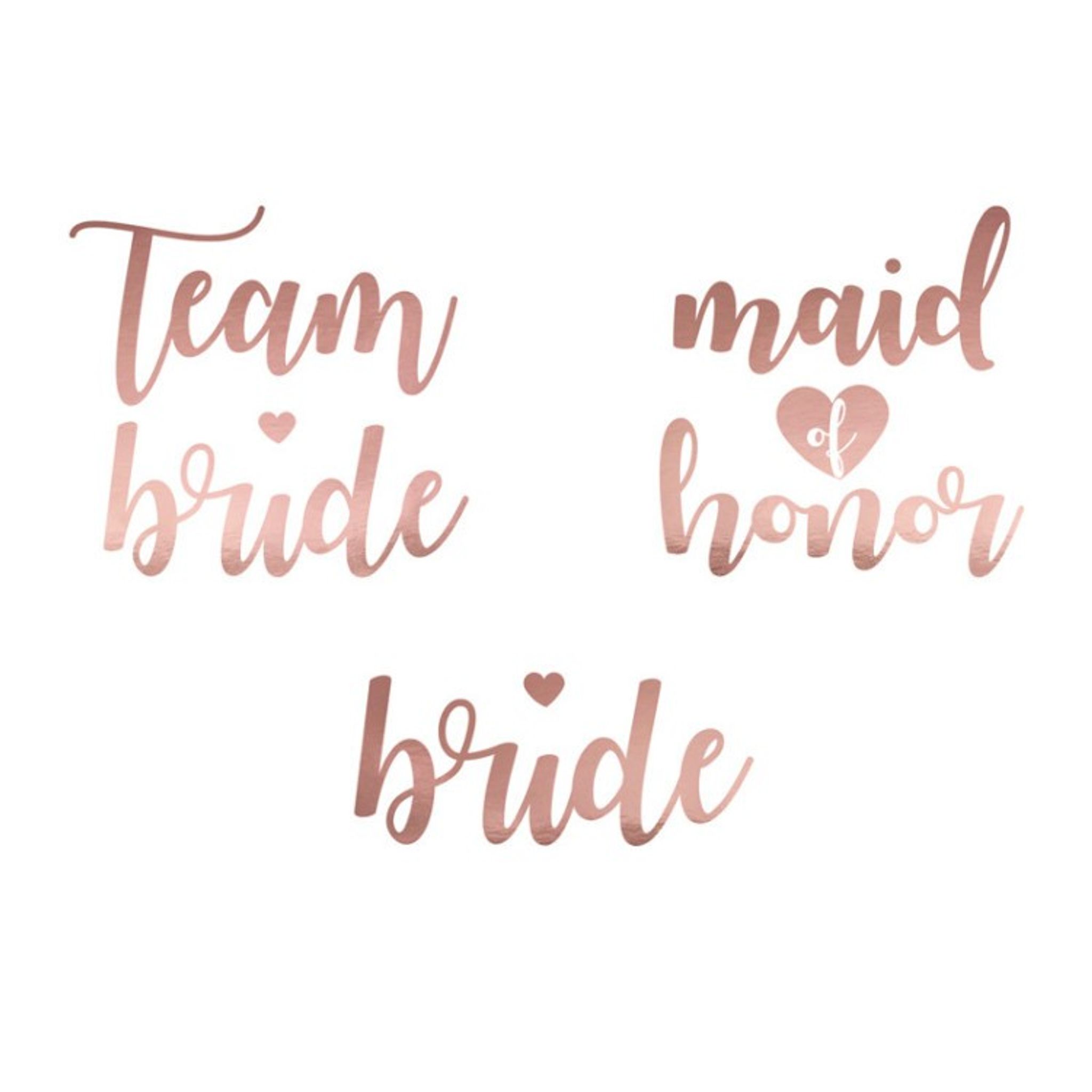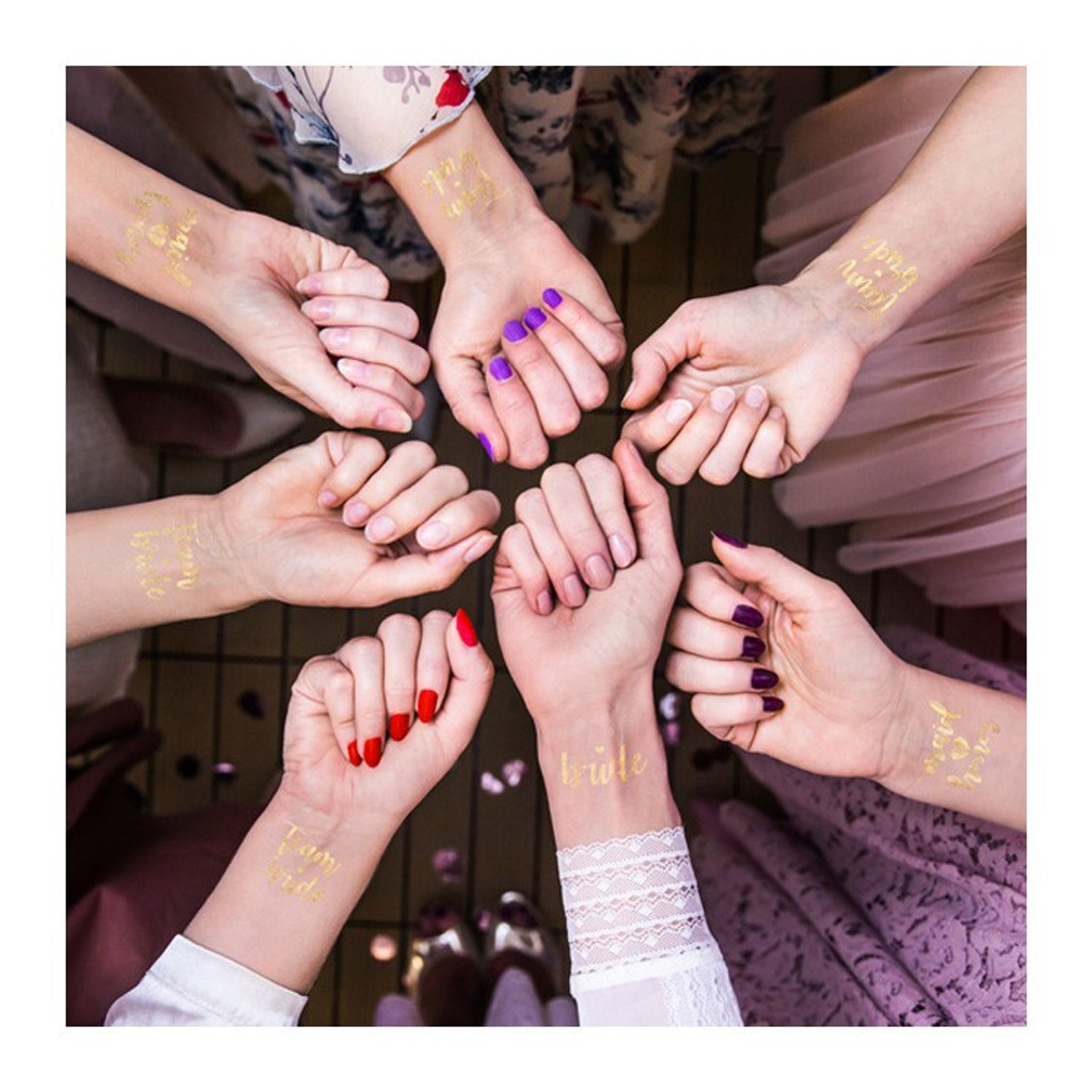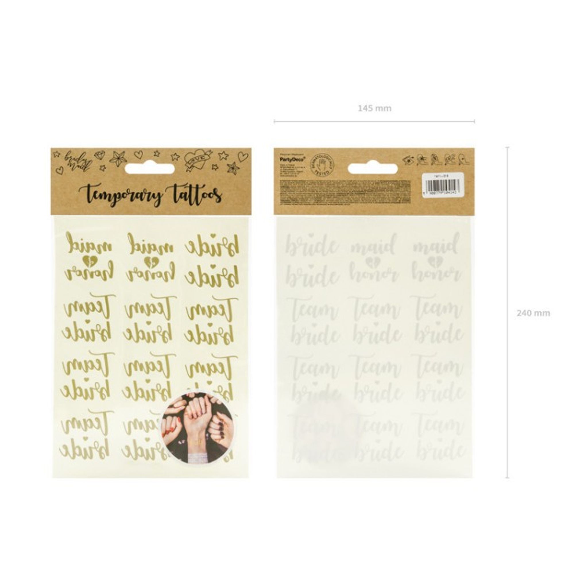 Team bride - säg det med guldiga engångstatueringar! Fin detalj till möhippan. Utsmycka er med engångstatueringar och fira den blivande bruden! Perfekt tillsammans med våra andra dekorationer till möhippa med motiv av "Team bride"!