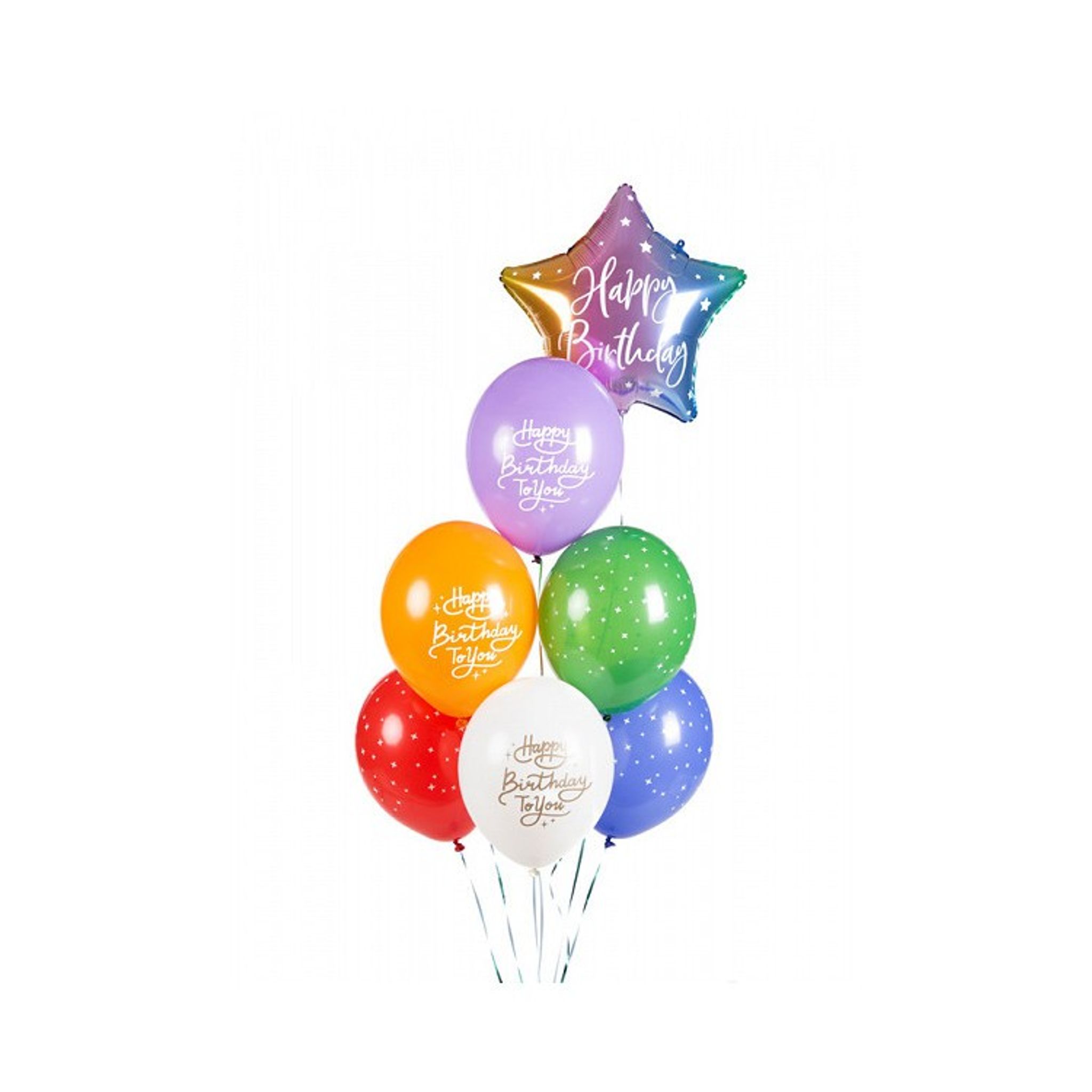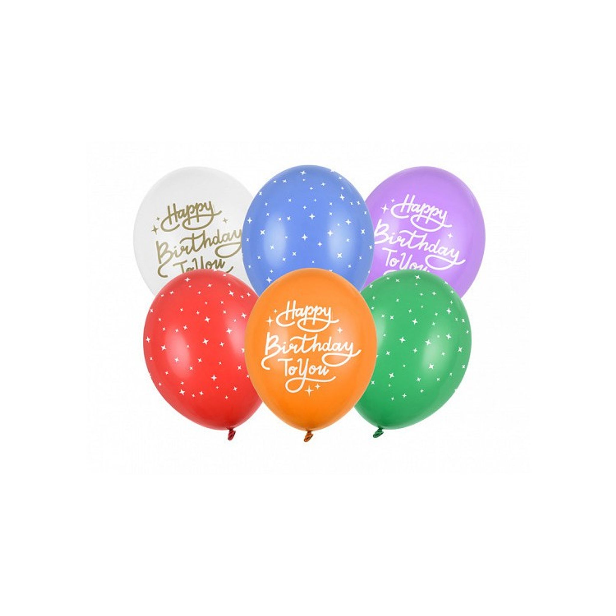 Festliga ballonger till alla möjliga födelsedagskalas och födelsedagsfester. Den här ballongmixen är en riktig färgklick och blir extra härlig att överraska gästerna med vid entren eller det dukade kalasbordet. På tre av ballongerna står det "Happy birthday to you" och resterande tre ballonger har tryck av vita små stjärnor.
