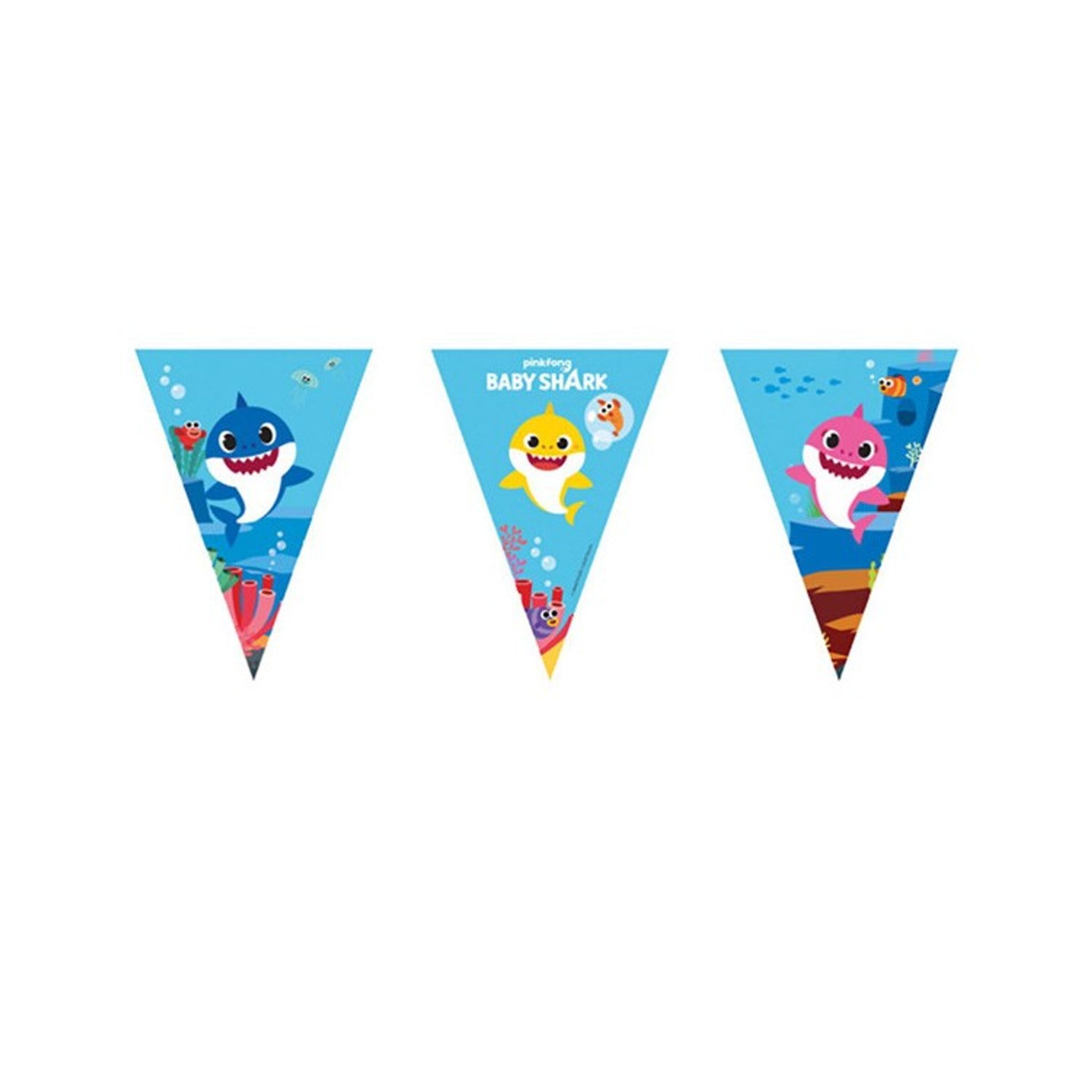 En härligt färgglad flaggirlang med motiv av Baby Shark. Perfekt att hänga upp som dekoration på kalaset, eller varför inte som dekoration i barnrummet. Vimplarna hålls ihop av ett ljusblått sidenband.