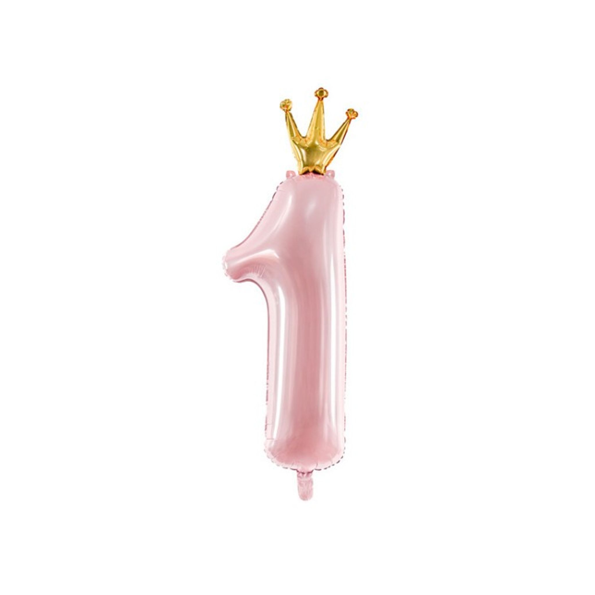 Folieballong i en skimrande läcker rosa färg i form av siffran 1 med en guldkrona. Fyll ballongen med antingen helium om ni önskar den svävande eller med luft och fäst den med dubbelhäftande tejp.