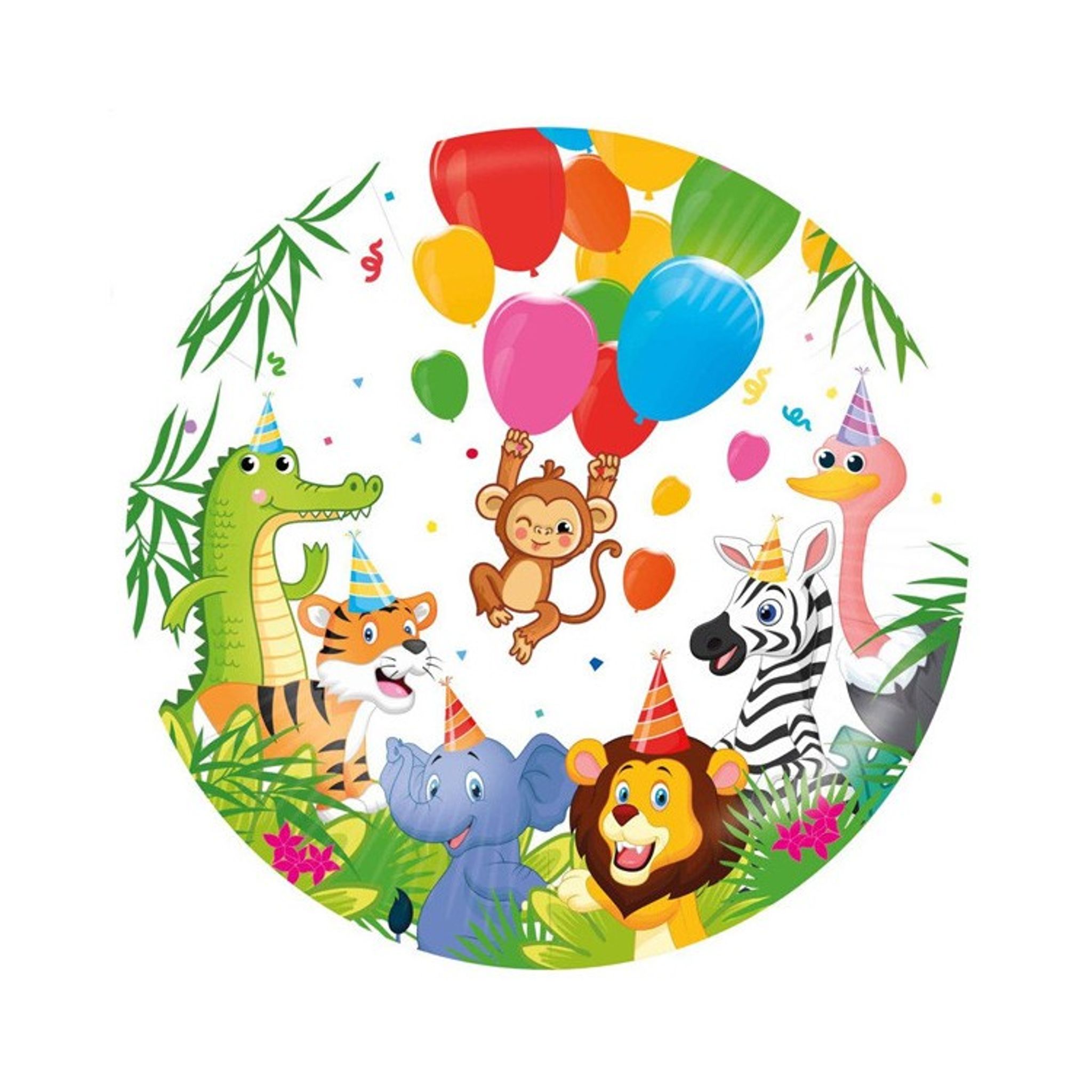 Fira födelsedagsbarnet med färgglada dekorationer. Med den här läckra folieballongen med en krokodil, tiger, elefant, lejon, zebra, flamingo och apa på blir just djungelkalaset något alldeles extra.