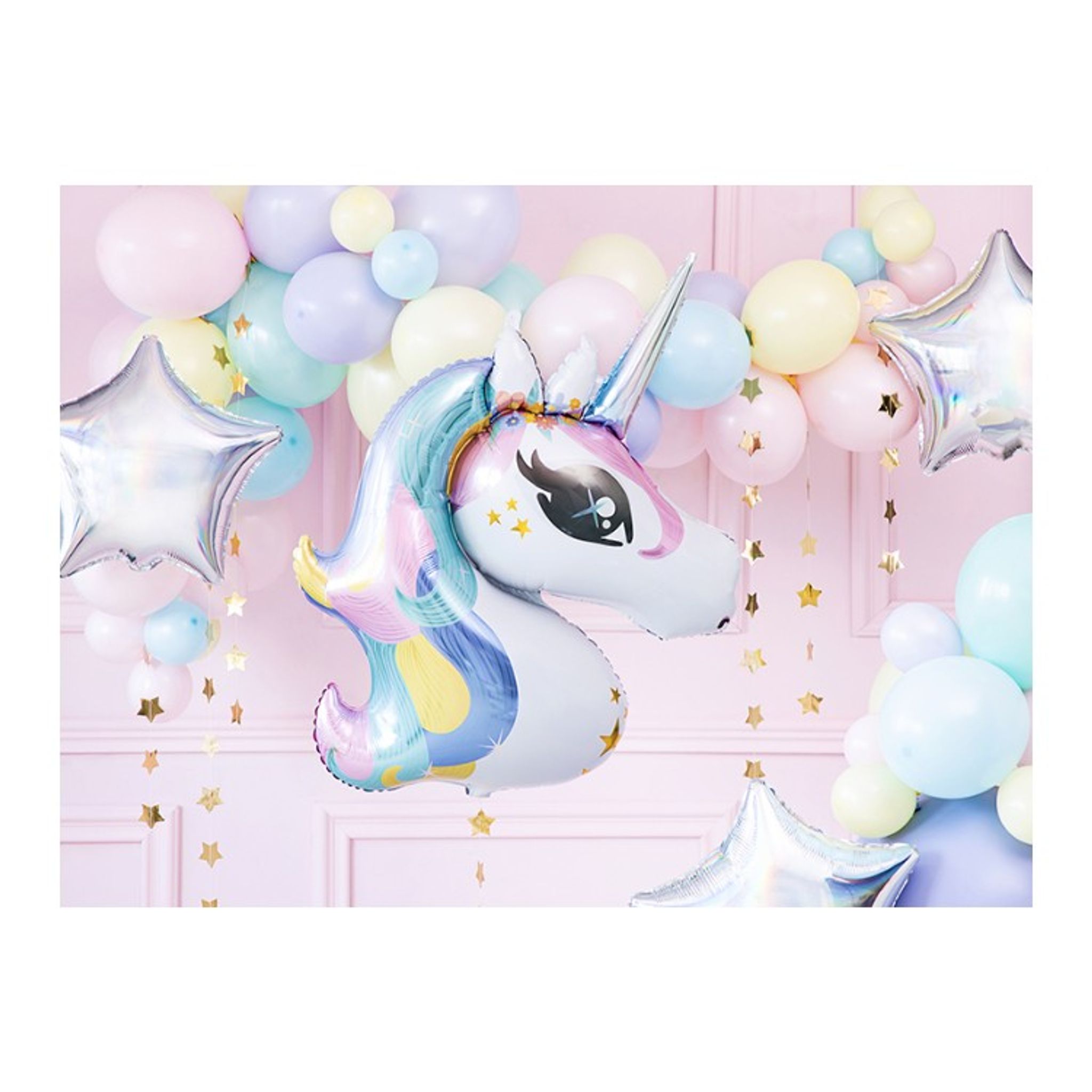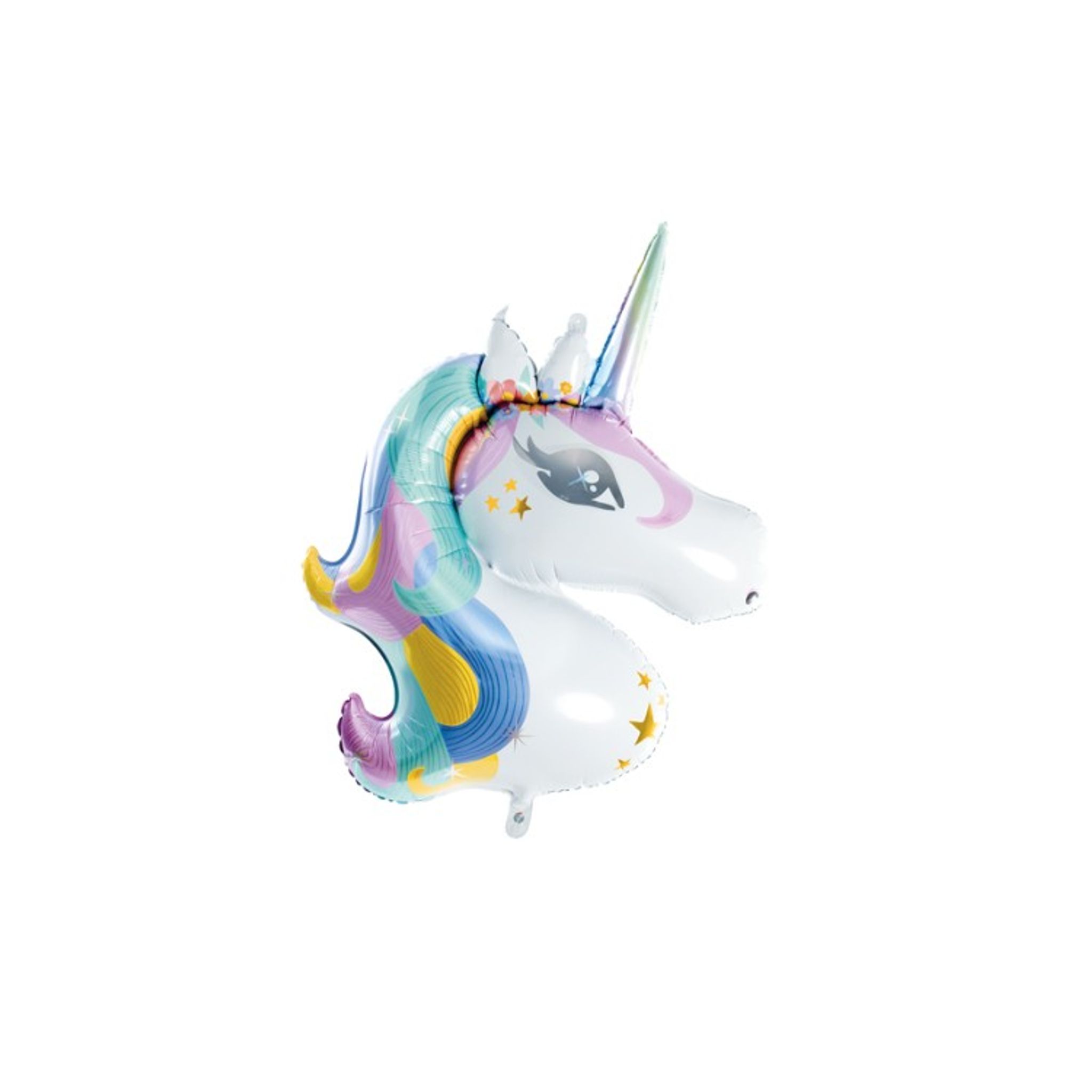 Folieballong med enhörning-motiv. Enhörningshuvud i vitt med härliga färger i man och horn som är mycket uppskattat av födelsedagsbarnet som bara älskar enhörningar!