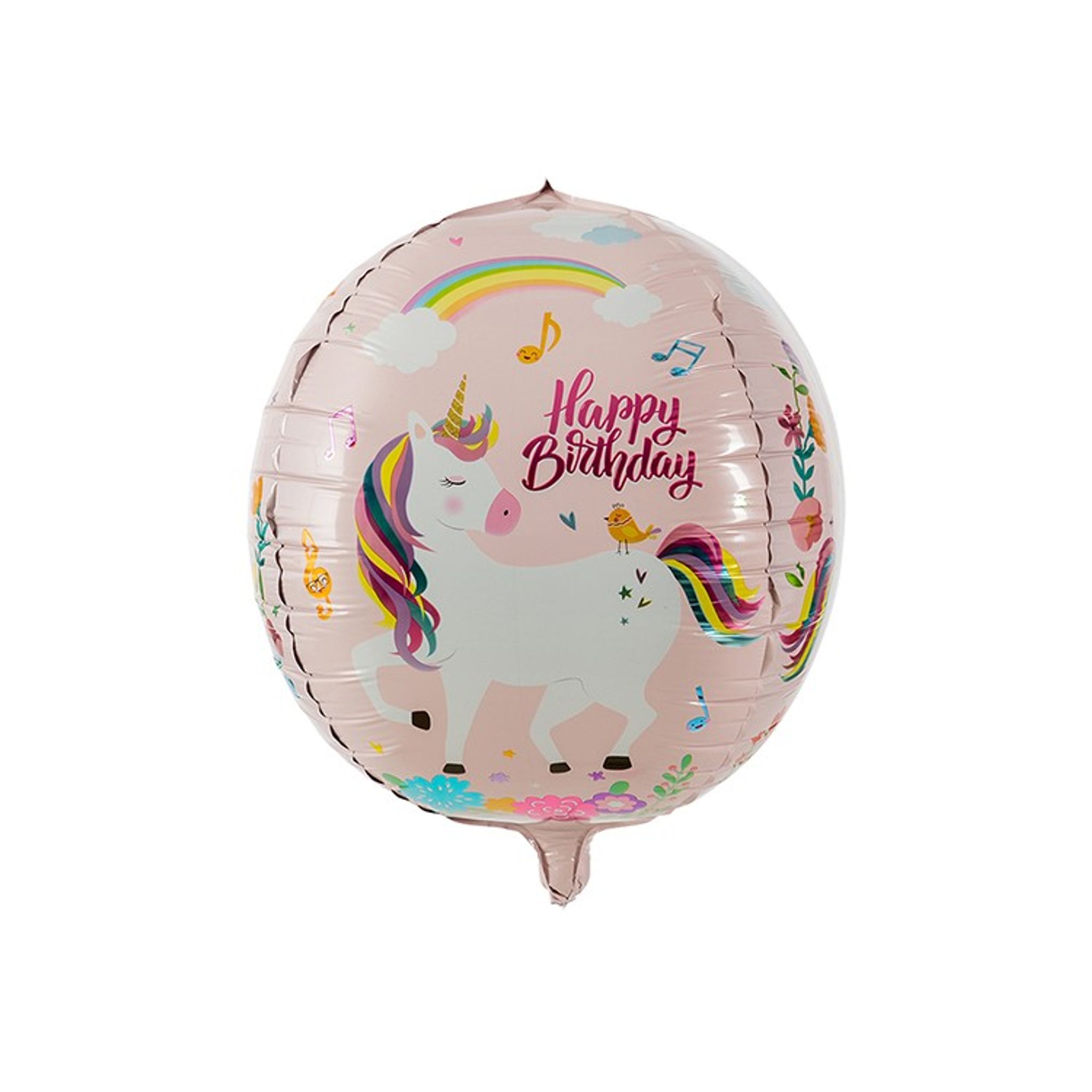 Folieballong i ljusrosa med enhörning och små gulliga motiv med blommor, noter, moln och regnbåge. Ballongen har en text i rosa där det står Happy Birthday. Storlek: 35 cm hög och 30 cm bred.